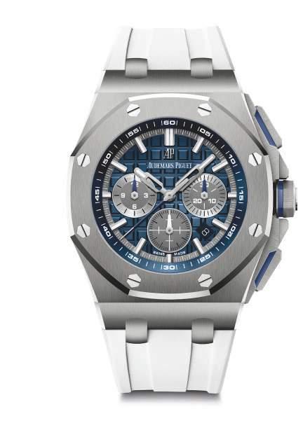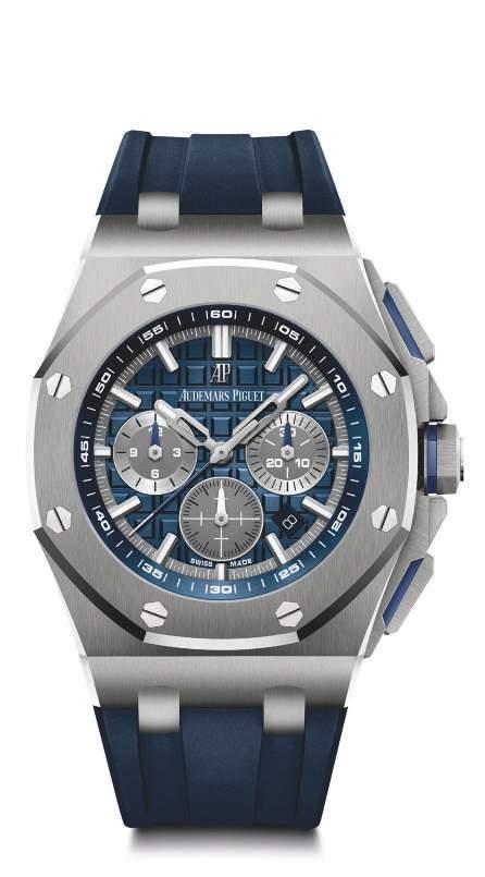 Cuenta con una caja de titanio, cristal de zafiro con tratamiento antirreflejos, bisel, pulsadores y corona atornillada de titanio, protectores de pulsadores de titanio, esfera azul de cuerda automatica de 42 mm con motivos “méga Tapisserie” contadores gris, indices aplicados y agujas Toyal Oak de oro blanco con revestimiento luminiscente, realce azul y una correa de caucho tambien azul.