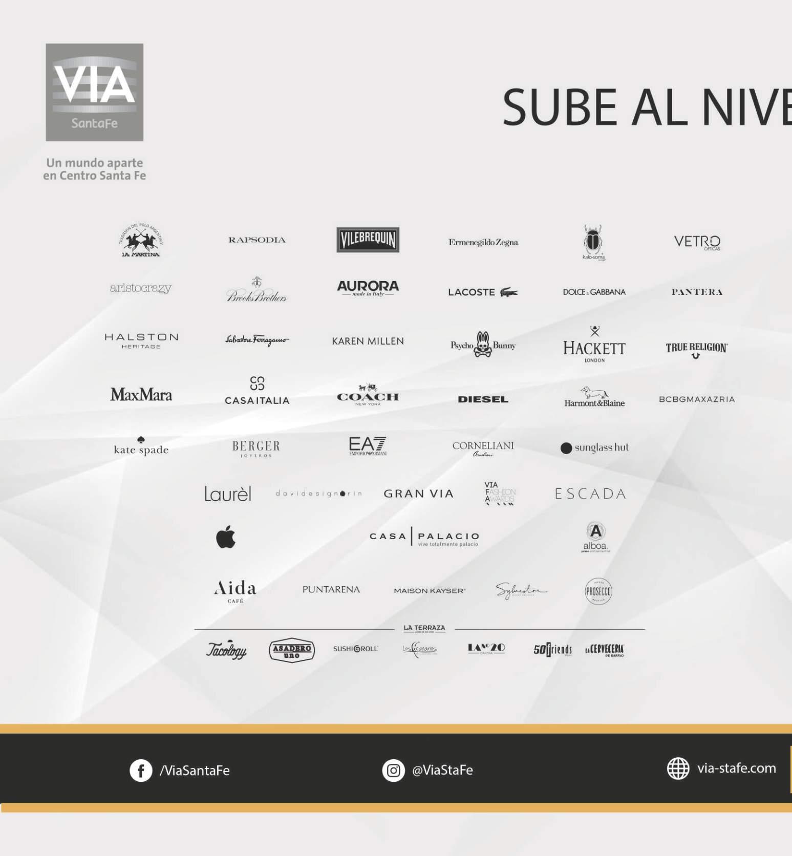 Ya que tenemos muy claro, colores y tendencias, es hora de visitar Vía Santa Fe, el centro comercial más cosmopolitan de México dentro de Centro Santa Fe. Aquí encontrarás lo ultimo en moda y accesorios, con lo más reciente de las pasarelas más reconocidas en el mundo.
