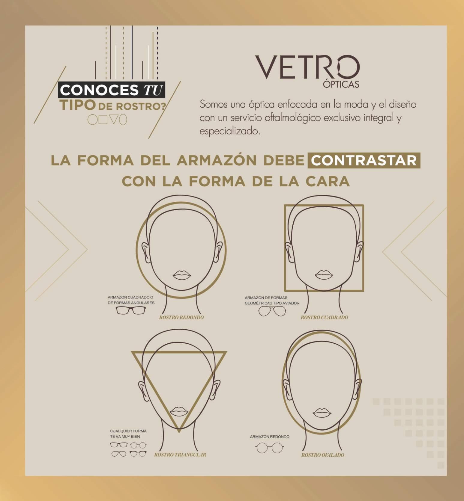 Vetro está equipada con la última tecnología y realizan un exhaustivo examen de la vista para ofrecer la mejor opción en función de las necesidades visuales. Tienen armazones vanguardistas y te los muestran basados en un cuidadoso asesoramiento de tu imagen y personalidad. En Vetro te dan asesoramiento personalizado, para que hagas una elección basada en tus gustos, actividades y tipo de rostro. Cuidan de la imagen de sus clientes y por eso hoy nos dan la clave para elegir los lentes de acuerdo al tipo de rostro: