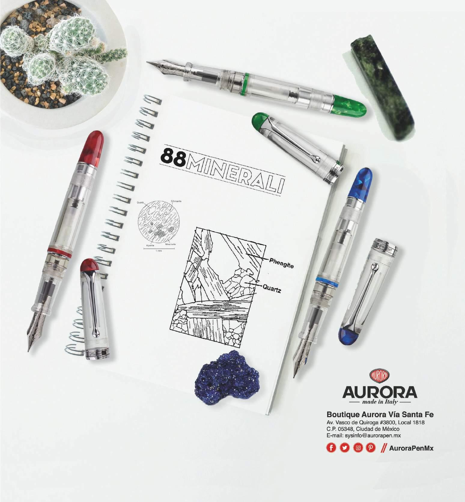 La naturaleza siempre es fuente de inspiración. Por ello, AURORA se enorgullece en presentar la colección ‘88 Minerals’, inspirada en la pureza y energía de los minerales; elementos naturales que se han destacado por el brillo y la belleza que emanan, Minerali Azurite cuenta con una tapa y un barril elaborado en resina transparente, decorada con detalles en cromo; su corona y su culote están decorados con mineral Azurite que le dan ese tono azul que la distingue. El plumín está elaborado en oro macizo de 18
