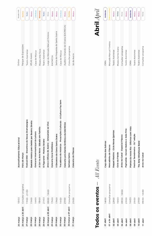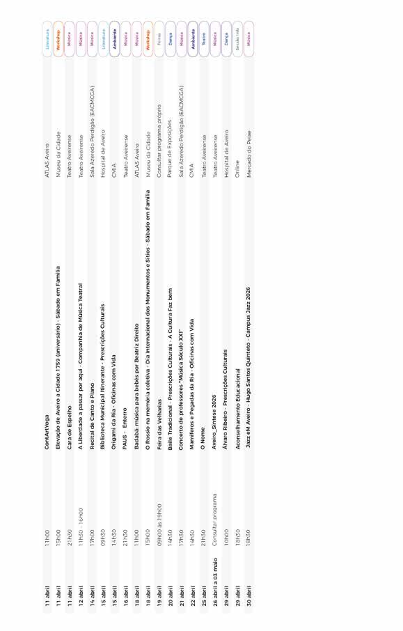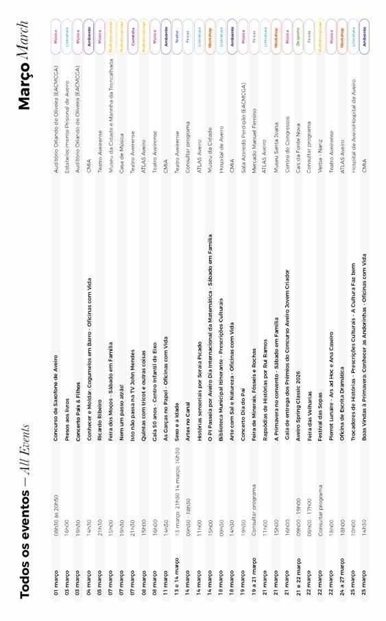 Ao longo destes dois meses, os Museus de Aveiro e a Biblioteca Municipal continuam também a oferecer uma programação cultural diversificada, especialmente dirigida às famílias, com atividades como os Sábados em Família ou as sessões de leitura no ATLAS Aveiro. No Teatro Aveirense, destaque ainda para o regresso do Festival Termómetro, no dia 9 de abril, reforçando o compromisso do Município com uma cultura viva, próxima e para todos.