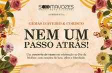 Os grupos Corisco e Gemas d’Aveiro preparam repertório alusivo ao Dia Internacional da Mulher. De Rita Lee à Capicua, a mesclar The Beatles, Zeca Afonso, Bobby McFerrin e cante alentejano, o espetáculo traz canções não tradicionais do repertório coral, com arranjos específicos para que muitas bocas cantem A MULHER.