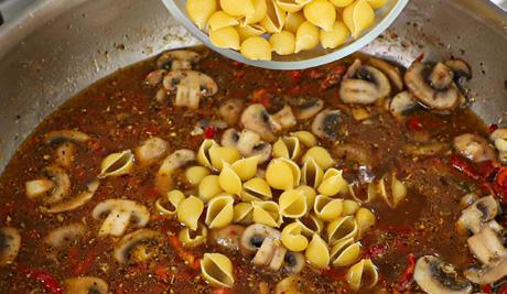 6. Stir in the broth and bring to a simmer. Add the pasta and stir. Lower the heat slightly and cover. Cook until the pasta is tender and al dente, usually about 10 minutes. Stir the pasta every few minutes.