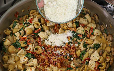 7. Remove the lid and stir in the sun-dried tomatoes, 1 teaspoon salt, ½ teaspoon black pepper, 1 teaspoon oregano, paprika (1 tsp), cooked chicken, and pancetta. Stir until combined.