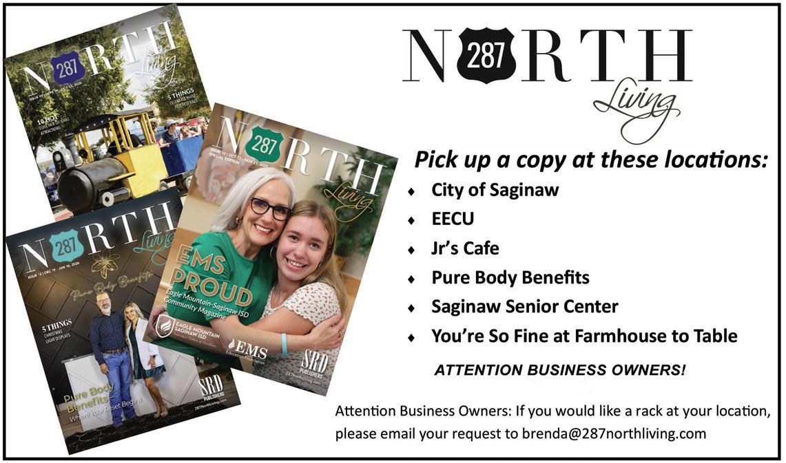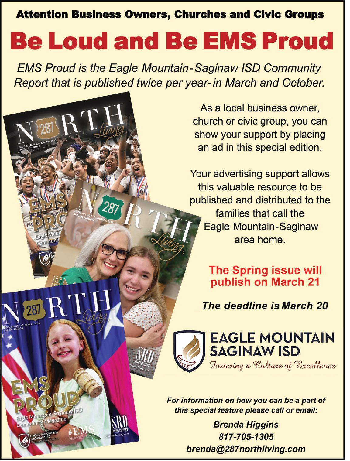 Our upcoming March edition will be our EMS Proud edition. If you have a business that would like to target the families that reside in the Eagle Mountain-Saginaw school district, reach out and ask how you can be a part of this publication.