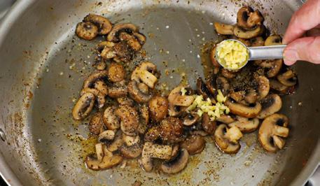 5. Add the mushrooms and sauté until softened and beginning to release their liquid, about 4 to 5 minutes. Season with a pinch of salt, pepper, and red pepper flakes. Add the garlic and sauté, stirring often, for another 30 seconds.