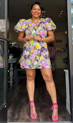 Our featured dress perfectly captures the spirit of spring with its relaxed fit, soft flowy shape, and eye-catching blue pattern. The statement sleeves and tiered design give it a flattering, comfortable feel while still looking polished and put together. Paired with neutral wedges and a woven tote, it’s an easy outfit you’ll reach for again and again as the weather warms up.