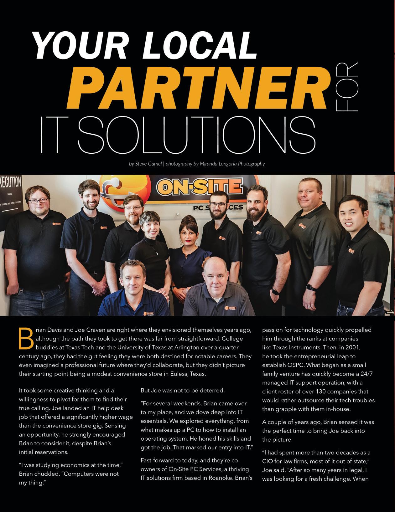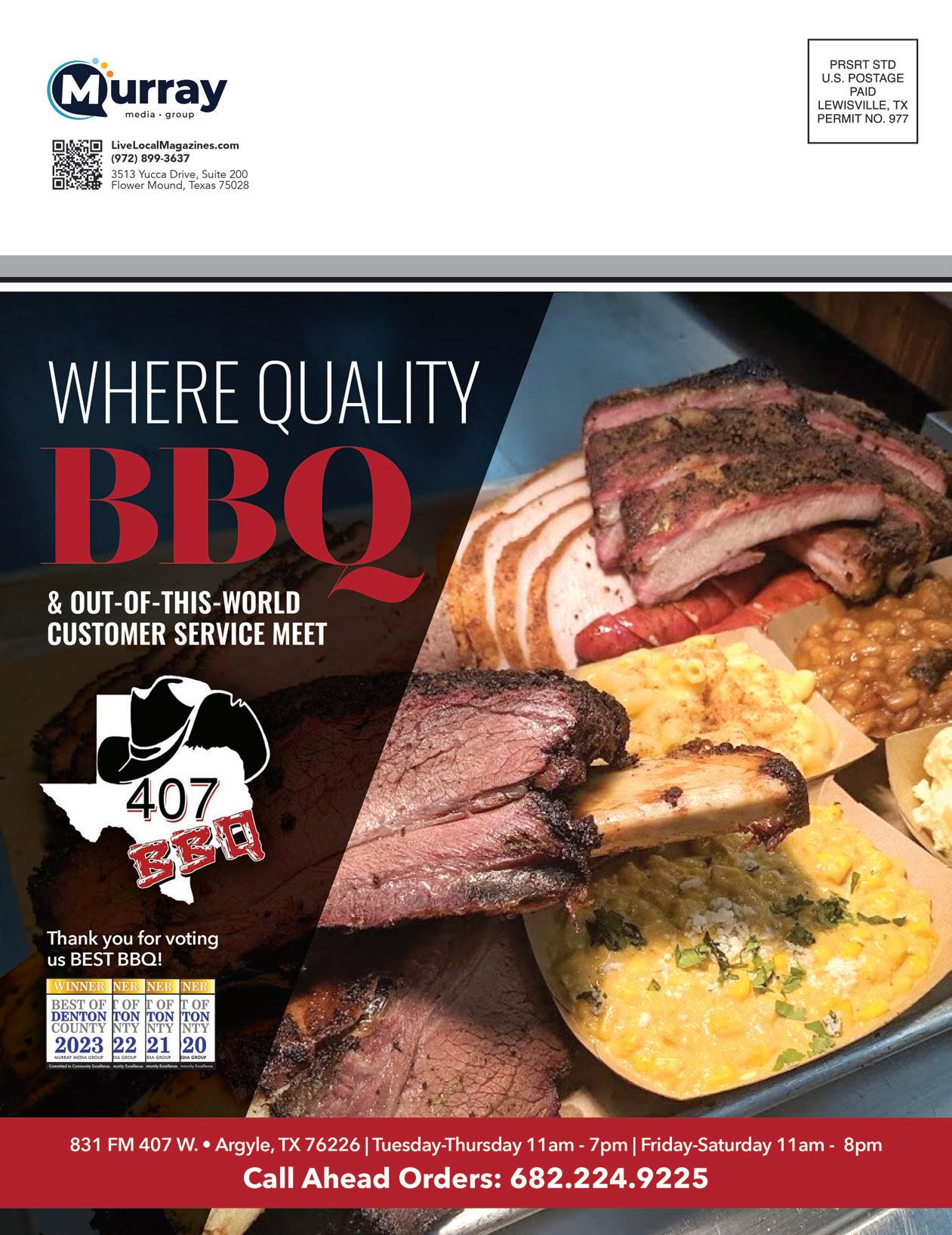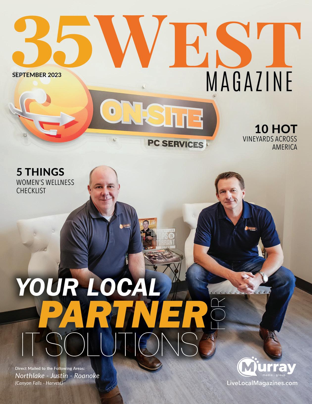 SEPTEMBER 2023 | 35 WEST | 5 LiveLocalMagazines.com 26 Deo Benard - Pro Bowler 08 Argyle Women’s Health & Wellness 09 5 Things: Women’s Wellness Checklist 10 Fall Fashion Guide 12 Ten Hot Vineyards Across America 14 Judge Andy Eads: Economic Development Drives The Future 18 Sheriff’s Corner With Sheriff Tracy Murphree CONTENTS 16 | ON THE COVER Brian Davis & Joe Craven with On-Site PC Services 19 The Original Roy Hutchins BBQ: Lip-Smacking Meats On a Different Level 20 Team Picks: Favorite Wine 21 Lantana Pediatrics: Mental Health & Children 22 How a Tall Texan Manages Time 24 Cultivating Awareness For Breast Cancer 28 Dentistry With Country Lakes Family Dental