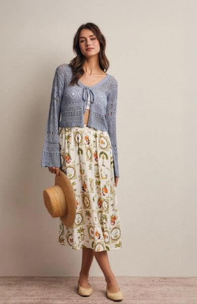 The style for Spring this year is all about romance—soft colors and delicate textures that feel light and feminine. Forté captures the trend beautifully with a soft blue crochet cardigan paired with a breezy printed skirt, creating an effortless silhouette that moves gracefully and feels perfect for the season. It’s the kind of outfit that feels both relaxed and polished, ideal for sunny spring days.