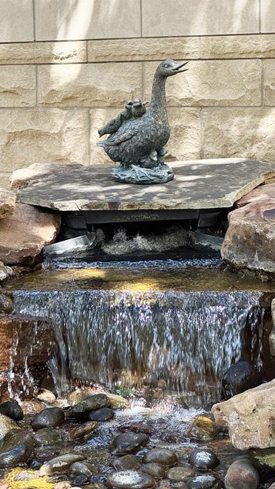 The healing garden is centrally located where visitors can grab their lunch or favorite cup of coffee and then weave their way through the garden to find a place to sit. The bridge and fountain are two meaningful features in the garden. An individual can listen and watch as the waters cascade from a fountain into a rock river underneath the bridge.