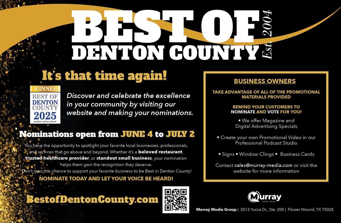South Denton Living is published monthly by Murray Media Group. Some articles and/or content may be sponsored by advertisers. Opinions expressed in articles or advertisements do not necessarily reflect the opinion of the publisher. South Denton Living is not responsible for omissions or information that has been misrepresented to the magazine. Advertisers and its agencies assume all liability for advertising content. No part of this publication may be reproduced or transmitted without the permission in writing from the publisher.