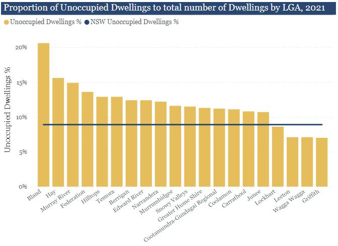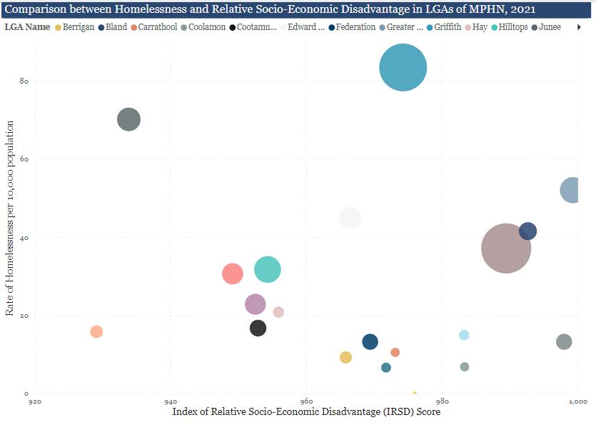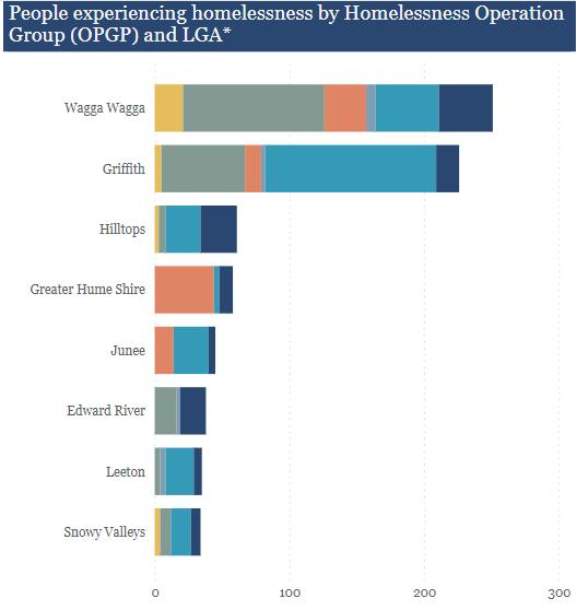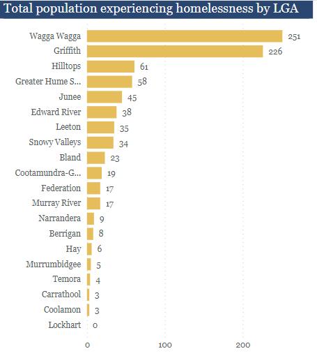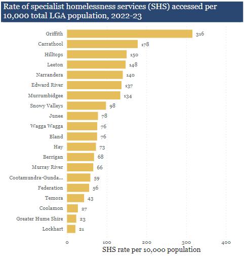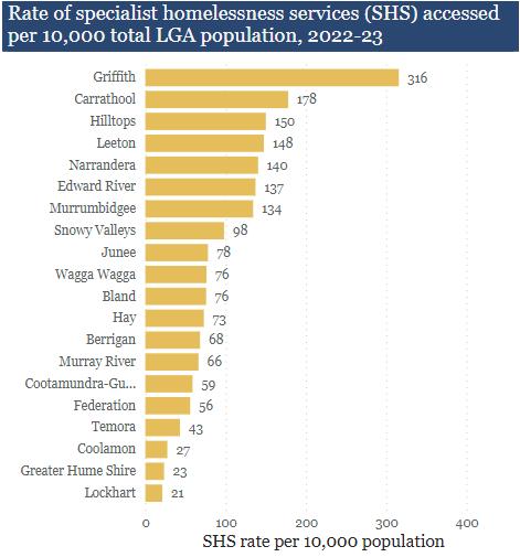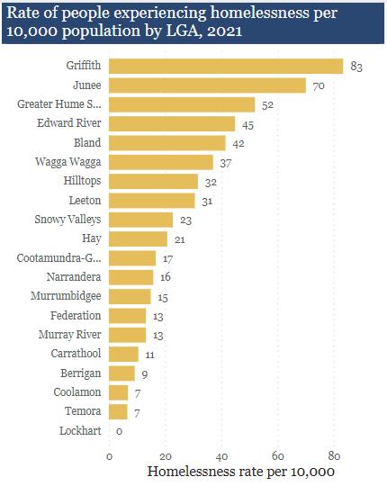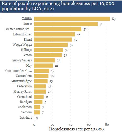While estimates of homelessness are generally underreported, about 1,000 people were estimated to be homeless in the region in the 2021 Census. Highest numbers were in Wagga Wagga and Griffith (~55% of total) but relatively higher rates in Griffith, Junee, Greater Hume Shire and Edward River LGAs.