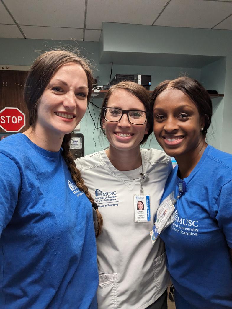 Karma is the Dean coming on clinical rotations! In the case of our rockstar students, this definitely was a relaxing thought. Welcome to the Dean’s Scrub Tour, where Dean Cathy Durham shadowed several ABSN students in Med Surg 1 this spring to share their clinical spaces and learn from their unique perspectives. With faculty members Chris Hairfield, Ph.D., RN, NPD-BC, and Dawn Terzulli, DNP, RN, PCCN, at the helm, students guided Dean Durham through their day at several MUSC units and even had her pitch in!