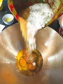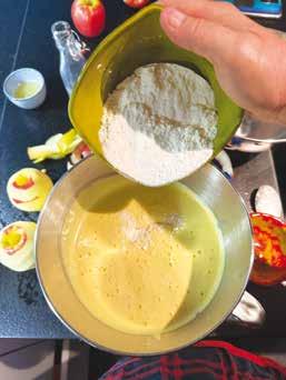 Schëtt den Zitrounejus op d'Äppel, da gi se net brong a si schmaache gutt. Gëff d’Schuel dobäi a mësch alles mateneen. Schëtt d’Mëllech bei déi schaimeg Eeër a réier gutt.