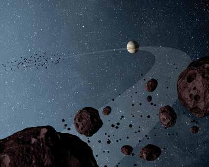 Donieft fanne mir awer och nach eng ganz Rëtsch Asteroiden um Ëmlafbunn. Si bilden zwou grouss Kludderen, eng virum Jupiter an eng hannert him, an dréinen zesumme mat dem risege Gasplanéit ronderëm d’Sonn. D’Wëssenschaft nennt si d’TROJANER.