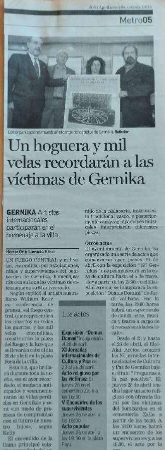 His artistic performances included Fire and Light at the Plaza of Peacemakers(2001) and Spiritual Figures: Peace Passages at the Fire and Light Plaza(shown during the 5th International Conference of Museums for Peace, held in 2005 in Gernika). These marked a prelude and an epilogue in the way of understanding the relationship between art and peace in our town.