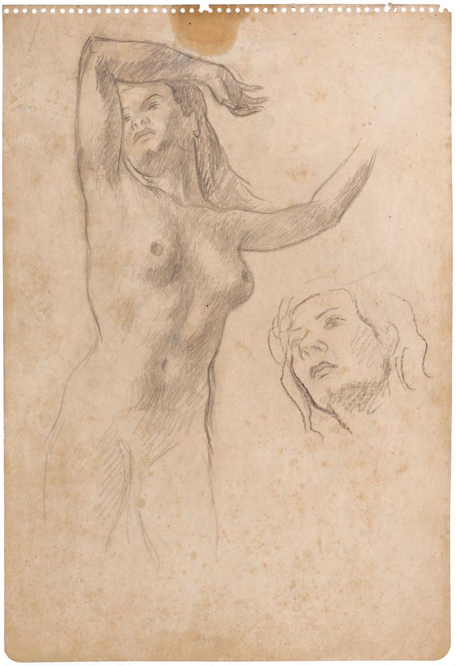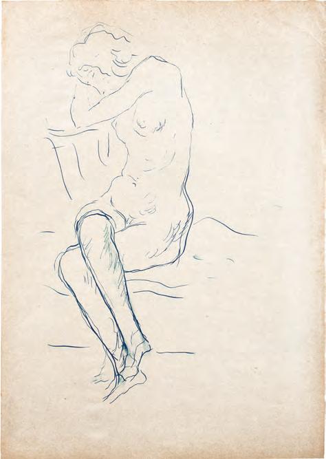 Además de la serie parisina aparece en el conjunto de los desnudos de mujeres el papel C at 36 (reverso) con dos desnudos de mujer –que puede leerse como reverso del C at . 36– y que inician una pequeña serie con las piezas C at . 37, C at . 38, C at . 39, tintas que marcan distintas poses y, en la mayoría, con el detalle del uso de medias que cubren las piernas hasta la mitad del muslo, iconografía que remite con fuerza a las mujeres de los burdeles. Son imágenes básicamente de líneas muy expresivas, sutiles, entre continuas y quebradas. La modelo parece ser siempre la misma.