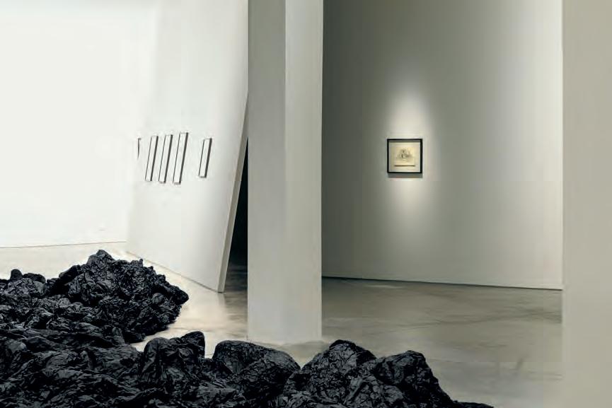 introducir en la realidad: su narración traza un recorrido que atraviesa el límite entre un plano y el otro. Pero, en el recorrido material de la sala, ese plano ficcional no es perceptible de inmediato porque las paredes te imponen una obstrucción, por lo que te vas introduciendo en ese espacio de a poco. Es una exposición muy cartográfica: hay un mapa de mi historia y un mapa real, físico, concreto, que recorrés. En el interior de este mapa real, además, hay otro mapa mayor, el negro, el oscuro, que podría ser la historia de la creación. Avanzás por un museo, una casa con obras de arte, pero de repente encontrás esa forma oscura que remite a algo mayor contenido en su interior, como encontrar algo sagrado dentro de lo profano.