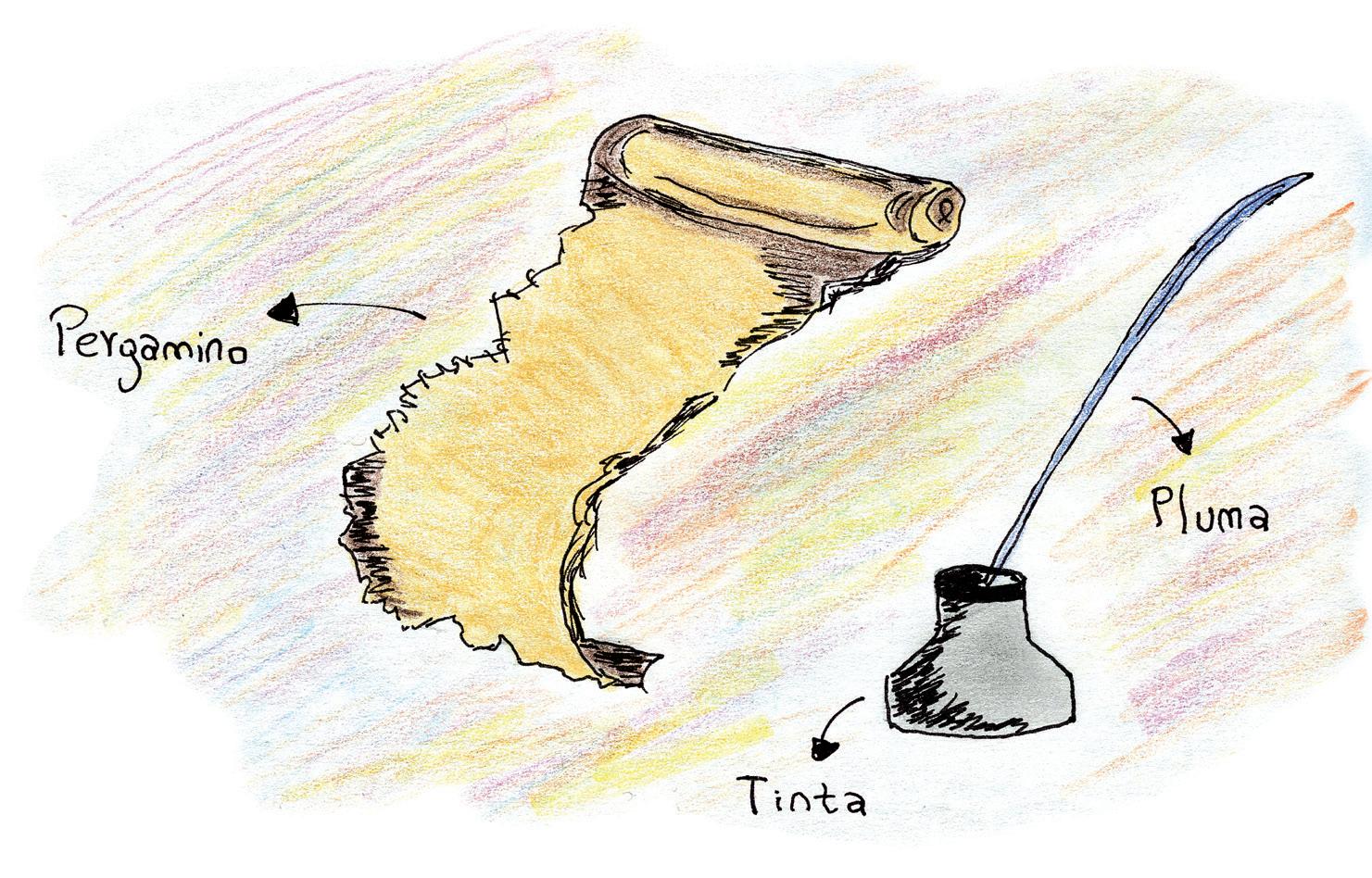 Los pergaminos los había comprado en Egipto, en una tienda de un mercado callejero. La pluma era de un azul intenso y se la había regalado su papá en su cumpleaños número diez.