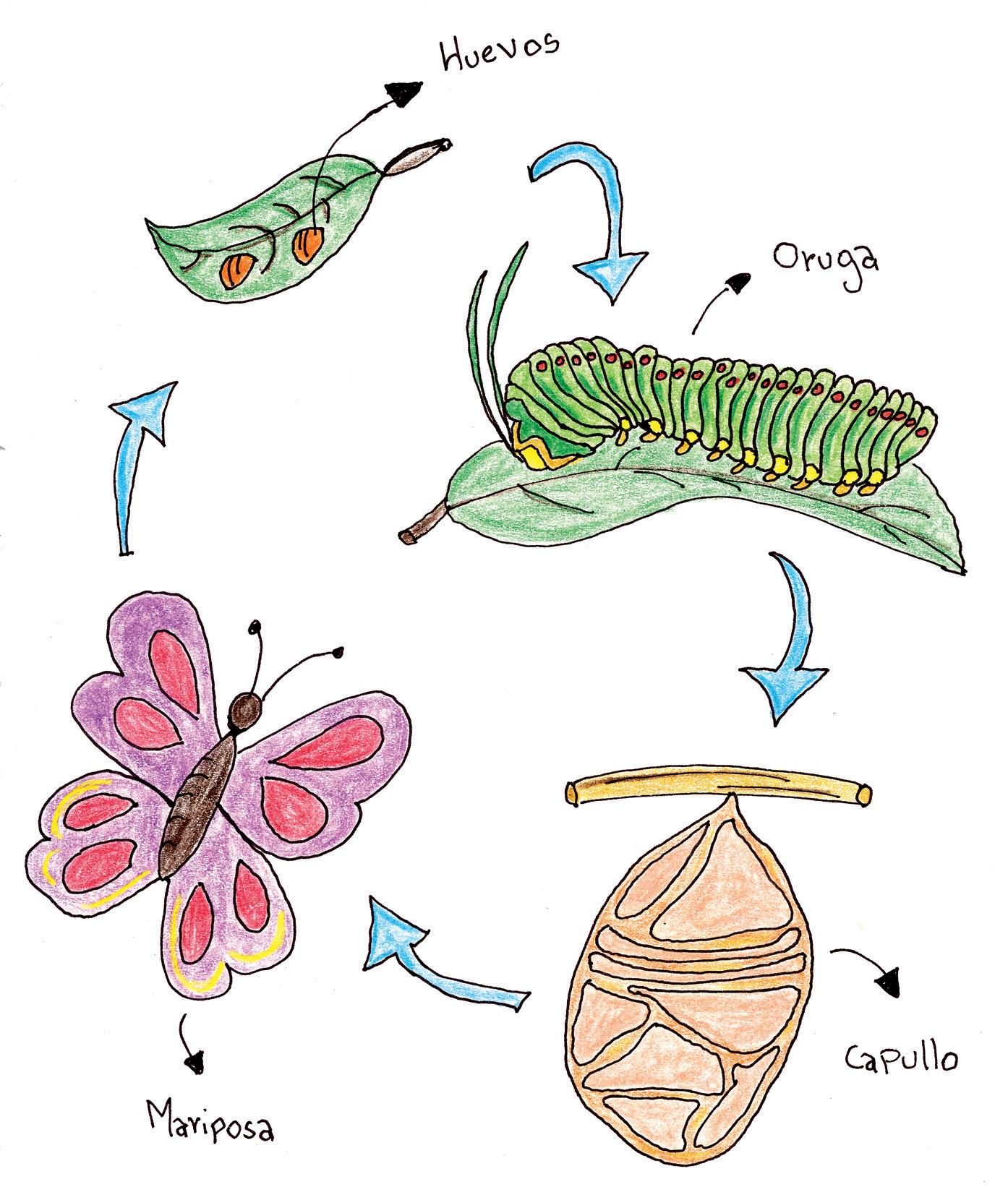 Antes de convertirse en mariposas, son orugas. La oruga es como un gusano. Cuando la mariposa se siente lista para crecer, fabrica un hilo con su boca y se envuelve en un saco llamado “capullo”, y cuando es el momento, sale volando de su capullo. Luego, esa misma mariposa pone huevos sobre las hojas, para que estos se conviertan en orugas, y las orugas en capullos, y de los capullos vuelen mariposas (a continuación, te lo dibujo).