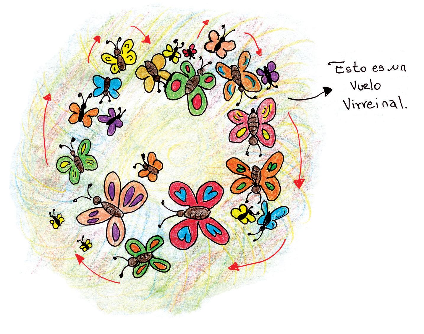 El vuelo virreinal tiene una particularidad: ¡Produce chispas de colores! Si lo mirás desde cuatro metros de distancia vas a ver un arcoíris de mariposas, pero lo más asombroso del vuelo virreinal no es el arcoíris, sino escuchar la música que componen las mariposas cuando realizan este tipo de vuelo. Las mariposas crean música en señal de auxilio para que alguien más escuche esa música y salga corriendo a ayudar al necesitado (como la sirena de los bomberos). La música de las mariposas no suena siempre igual.