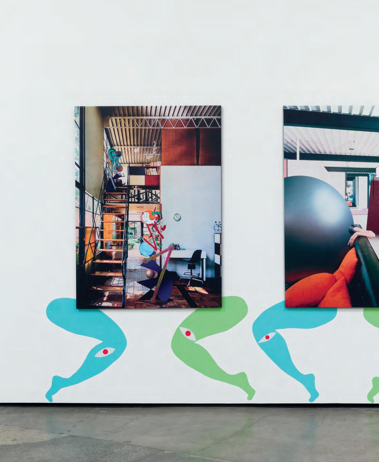 specific [de sitio específico] que se realizaron para esta ocasión. Pero esa temporalidad también se manifiesta en el interior mismo de ciertas series, como “Fantasías” o “Queer Deco”. En las nuevas piezas hay ligeras diferencias respecto de sus antecesoras. Así, cada serie se abre a su propio torbellino: estas obras son la consecuencia de una acumulación de capas temporales, tanto por las referencias visuales que incluyen como por las intervenciones sucesivas que han tenido y tendrán en el futuro. “Fantasías” crea seres compuestos por líneas y geometrías planas que parecen haber sido extirpados de la modernidad visual de principios del siglo XX para reubicarse en paisajes pintados a lápiz y aerógrafo, con la profundidad y suavidad de los dibujos animados populares de Hanna-Barbera, de las décadas del cincuenta y sesenta.