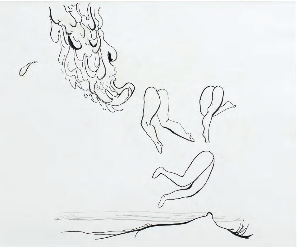 la que el carácter orgánico de las piernas humanas y de la naturaleza desmesurada contrasta con la racionalidad y el control de un mobiliario cotidiano como la silla. En segundo lugar, la intervención que realiza para esta exposición, con un par de nuevas piernas pintadas debajo de cada dibujo, ubica temporal y espacialmente a esas obras de 2005 en el presente, impidiéndoles su fijación temporal. En tercer lugar, esas piernas nuevas que sostienen los dibujos les otorgan un carácter vivo y móvil, como si se tratase de cuerpos que se trasladan por la sala: las convierte en sujetos. En esta secuencia, Minoliti plantea tres estrategias que cruzan, en proporciones distintas, todos los rincones de su obra.