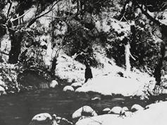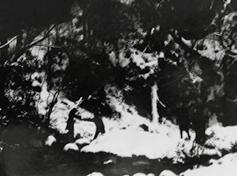La textura de la cámara utilizada en los informativos de la televisión da cuenta del tipo de imagen de la época, propia de soportes profesionales anteriores al medio digital. Con la industrialización del siglo pasado la especie Pinus radiata fue reemplazando el bosque autóctono. Esta transformación artificial del entorno oscureció progresivamente la gama de tonos del horizonte.