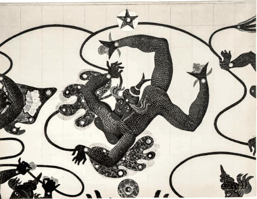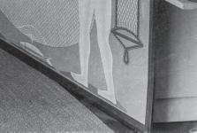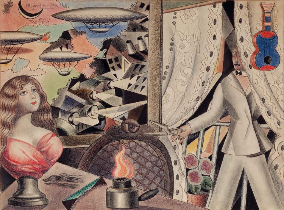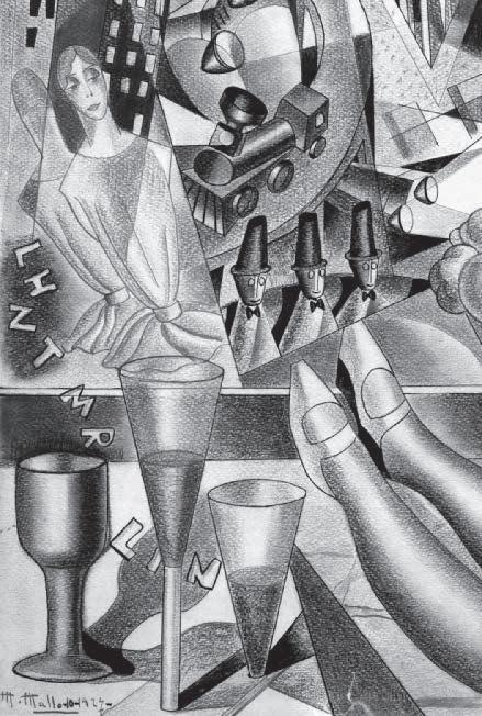 Pero las Verbenas son también una reflexión sobre los poderes mágicos del arte, el del pueblo —que Mallo llama “creaciones mágicas de medidas exactas”—, así como del suyo propio. Gómez de la Serna la llamaba brujita, meiga y pitonisa. En esta serie aparece la magia en su forma más trivial: la echadora de cartas que predice el futuro; aunque también en la forma más elevada del sabio que conoce los secretos del universo: Valle-Inclán se representa como mago astrónomo, que mira cariacontecido al suelo mientras una niña observa el firmamento a través de un telescopio de cartón (p. 35). Y vemos sobre todo a Merlín, el mago celta —ella se consideraba celta—, y a quien Cervantes describió como “protoencantador de los encantadores” en el Quijote. La artista sitúa sus Verbenas en un papel de archivo bajo el signo del humorismo, e inscribe en el iglú de Merlín las letras TSHL, teléfono sin hilos (p. 39). Es una broma sobre la capacidad del mago de comunicarse con otros mundos, pero es también una referencia a este como científico de antaño. Merlín va a ser un personaje reiterativo en la obra de Mallo. Así mismo aparece en sus Estampas (1927-1928), en lo que el periodista mexicano Alberto Rembao describe como un “mundo de brujería caballeresca del siglo quinto que se levanta de la sombra pretérita evocado por estos grabados en negro y estas láminas en color... Evocado por el viaje de la artista de un abismo al otro abismo”8. Una lectura que permite identificar como Merlín a la figura de una estampa de 1927, por las letras inscritas a su lado —MRLIN— junto a otras —LHNT—, que podrían significar “la hora de nuestro tiempo”, lema que repite Mallo en varias ocasiones y que se refiere a la obligación del artista de ser el reloj de su época (p. 42). Ella llamó también simbologramas a sus Estampas, que contienen numerosas iniciales que probablemente sean claves para identificar el aún misterioso contenido de estas imágenes. En la estampa citada, Merlín y un ángel flotan entre dos mundos, al fondo se distingue una geometría de rascacielos y faros de automóviles, y en primer plano unas redomas humeantes y unas piernas femeninas de madera. Las imágenes de la ciudad, edificios, trenes, zepelines, aparatos de cine, láminas científicas o técnicas (entre ellas mapas o planchas horadadas de cajas de música) se proyectan en todas direcciones dando un ritmo vivaz a algunas de las composiciones, que se contrapone al letargo de las figuras. Una tensión paradójica entre lo vivo y lo muerto que Maruja Mallo persigue a partir de entonces en su obra, en la que alternará series con y sin figuras. Estas se han considerado una representación de la cosificación femenina o el melancólico duelo de la artista tras su primera separación de Rafael Alberti. Responden también a la crítica a la deshumanización no ya solo del arte, sino de la sociedad, producida por la mecanización industrial, que se va a acentuar en los siguientes años. Un subgrupo de esta serie es el cinemático. Quizás refleje películas concretas, pues su atmósfera recuerda a la del cine expresionista, pero lo que parece interesar a Mallo del cine es su capacidad para crear la simultaneidad espacial no a través de la yuxtaposición de escenas, un procedimiento teatral que había ensayado en las Verbenas, sino mediante las