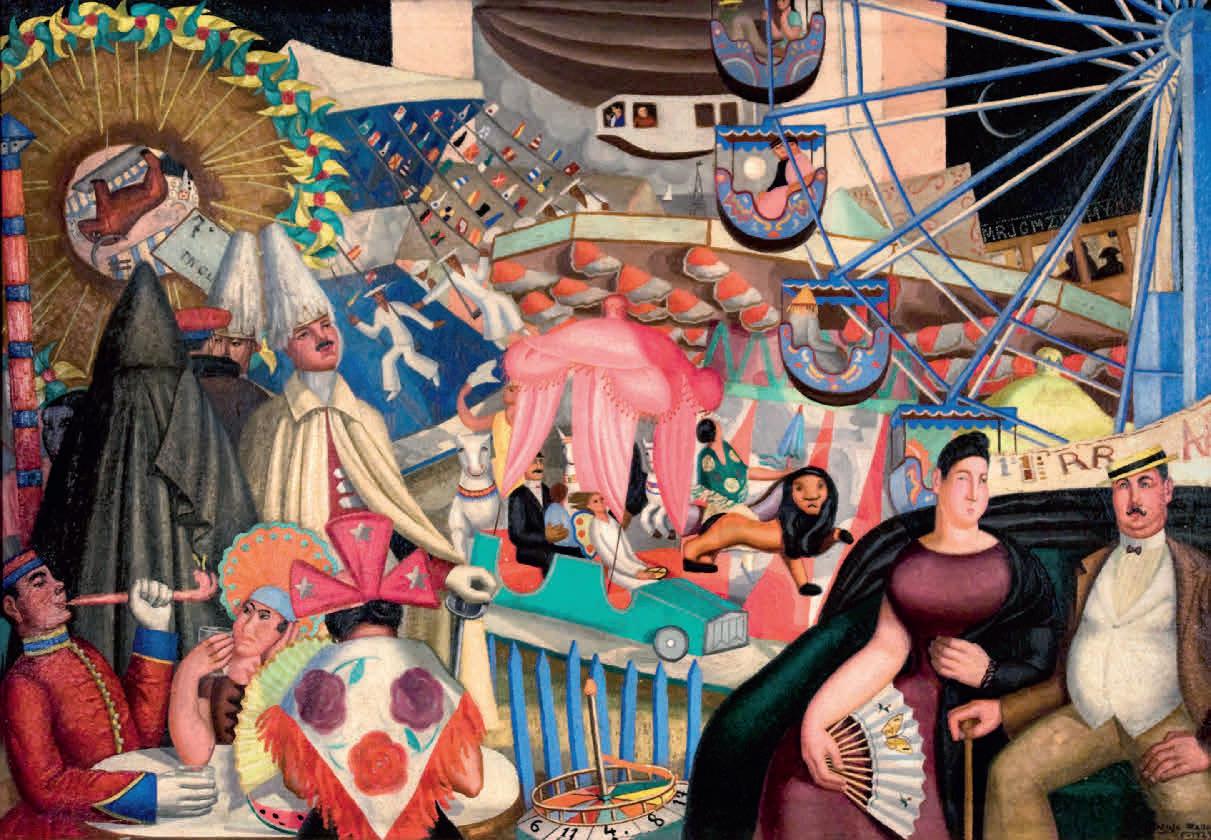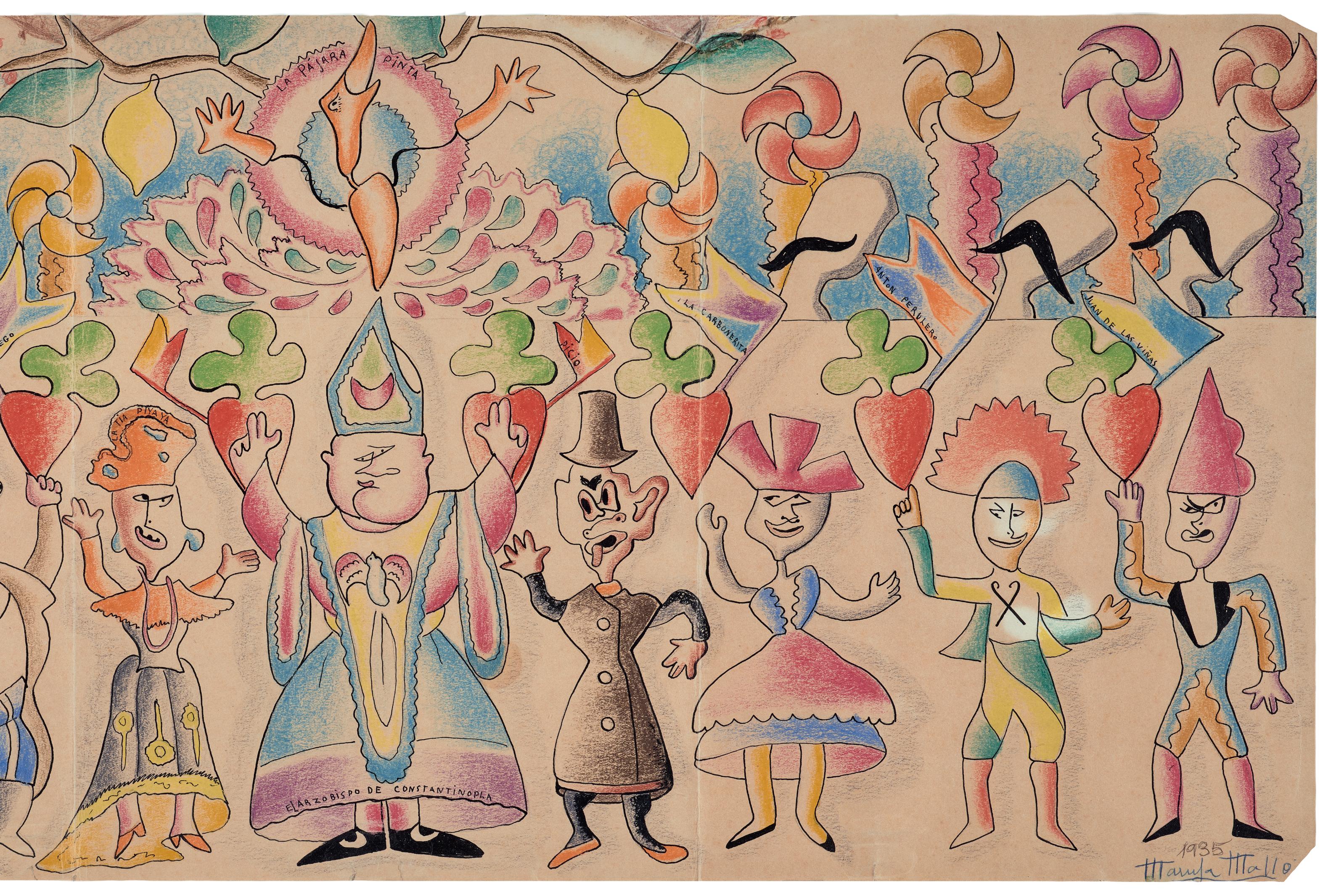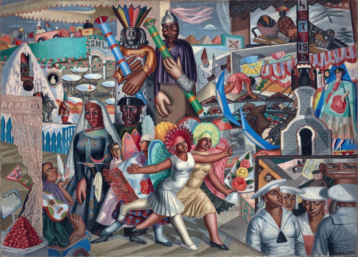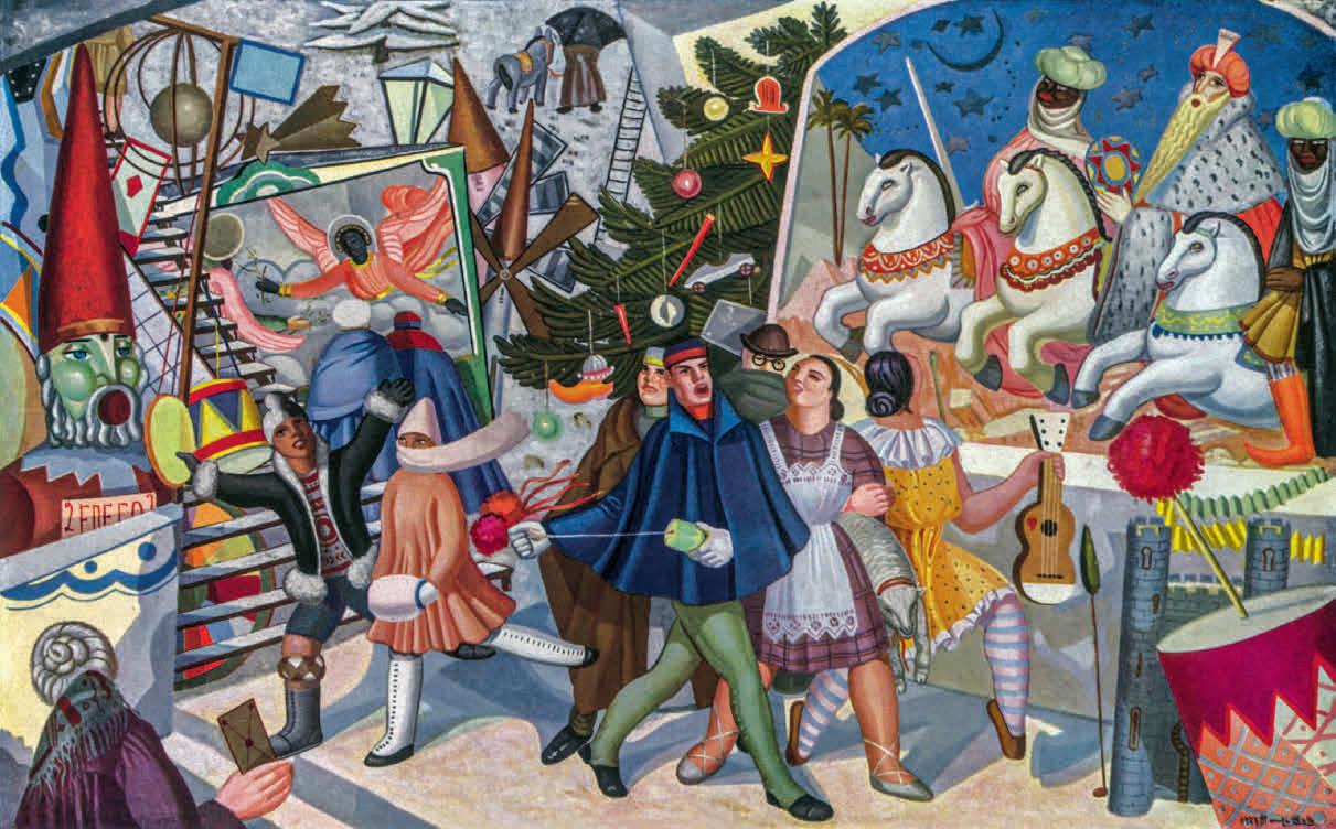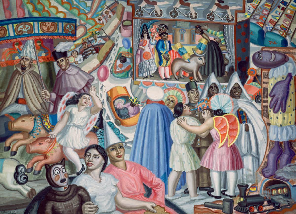 y mítico. Y por último, en su interés por la objetividad de la ciencia como medio de explorar lo desconocido, los abismos del universo y los del ser humano. O más bien de la mujer, protagonista de sus cuadros, en los que construye una épica femenina que trasciende épocas y lugares. A Mallo no le preocupaban mucho las adscripciones y supo responder a las preguntas de su época sin desviarse de su propio camino; una característica que compartía con sus contemporáneos de la generación del 27, que utilizaron más el concepto de arte nuevo o avanzado que el de vanguardia, considerando los ismos como una jaula para la libertad del artista. Esa generación surgió en el momento optimista de la primera posguerra mundial, cuando la dictadura anunciaba su descomposición y la cultura aparecía, siguiendo el magisterio del filósofo José Ortega y Gasset, como instrumento motor de los cambios necesarios para regenerar España, europeizarla y educar al pueblo. En los debates del momento entre arte minoritario y vanguardista o uno popular dirigido a las masas, la mayor parte de sus miembros optaron, como Mallo, por soluciones híbridas, no excluyentes. Maruja Mallo se dio a conocer desde su inicio como la mejor intérprete de lo popular, por su visión colorista de la calle como escenario de verbena, en la que el pueblo despliega su vitalidad y creatividad. Pero hay que entender que si esto fue así, se debió a que su trabajo, iniciado en 1927, se apartaba del concepto de lo popular más difundido hasta entonces, ligado en ese momento a la Exposición del Traje Regional e Histórico presentada en la Biblioteca Nacional dos años antes. En España cobró especial importancia por la crisis rural, que haría de la reforma agraria un asunto social de primer orden para la Segunda República y sus políticas, no solo económicas, sino también pedagógicas y museísticas (en 1934 se creó el Museo del Pueblo Español). El término “popular” se había generalizado en Europa desde finales de los años veinte para rehuir las voces “folklore” o “etnología”, más ligadas a identidades locales o raciales, que estaban siendo utilizadas políticamente en el momento de alza de los estados totalitarios. A Mallo no le interesaba el estudio de las costumbres en vías de extinción, ni lo pintoresco, sino lo popular como cultura viva, del pueblo, un colectivo más amplio que el del campesinado o el proletariado, y del que ella misma formaba parte. Las Verbenas comprendían una amalgama de elementos rurales y urbanos, ancestrales y contemporáneos, que tuvieron tanta importancia como el cine en su primera etapa. Con ellas, la artista presentaba una visión alternativa a “los negros del tremendismo, las estridencias de la espagnolade, las cenizas de la penitencia”, que, como decía Rosa Chacel, dominaban la percepción de España por parte de la generación del 985 La propia artista definiría el arte popular como “la representación lírica de la fuerza creadora del hombre”, y las fiestas populares como “la afirmación vital contra el fantasma”6, en las que el pueblo pujante se divierte burlándose del poder y de las convenciones. En las Verbenas encontramos personas de todas las clases y las razas, retratadas con humor: ángelas negras, reyes y magistrados de cartón piedra, toros y manolas ridículos, intelectuales montados sobre cerdos de tiovivo, soldados marroquíes departiendo amigablemente (es el momento final de la guerra de Marruecos). Girando incesantes alrededor de las atracciones, que las trasladan a mundos alternos, se distinguen: las pirámides del desierto y las chinas, las nieves nórdicas y los gnomos o siluetas chinescas tras las que sacar la cabeza. Entre la turba parecen estar también los intelectuales de referencia del momento: Ortega y Gasset, Juan Ramón Jiménez, Ramón del Valle-Inclán y quizás también Ernesto Giménez Caballero, es decir, el faro intelectual por excelencia, el poeta del intimismo, el creador del esperpento y el activista de la vanguardia. Incluso Mallo se podría haber retratado a sí misma, agazapada tras dos jóvenes en primer plano. Como escribe la periodista Melva Luna, Mallo presenta la verbena como un ballet rítmico “del que extrae el sentido de fraternidad de la fiesta”, la “cordialidad que intenta romper habituales injusticias”7