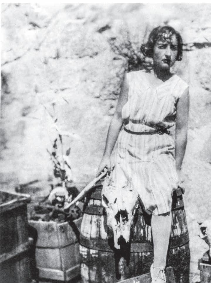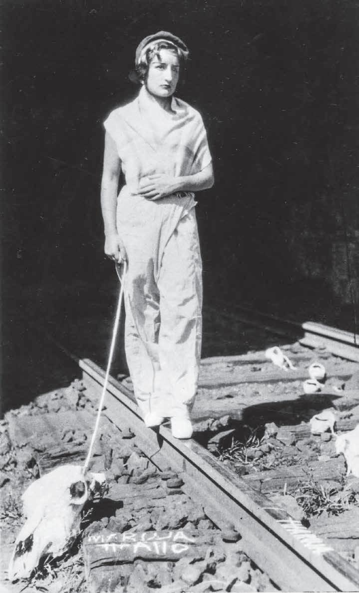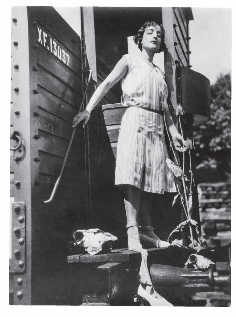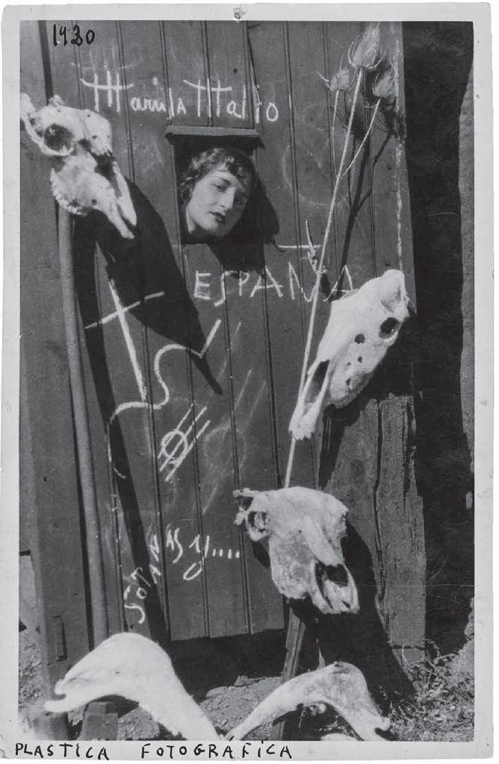 y la otra alpargatas de campesina, de nuevo una alusión a esa fraternidad —de clase y de raza, en este caso— que citaba Melva Luna. Si con esas imágenes Mallo presentaba una versión idealizada de la mujer nueva, en las Estampas de deporte, perdidas casi todas, aparece como mujer real. Son una tenista, una ciclista (un retrato de su amiga la poeta Concha Méndez) y una pareja de bañistas (una de ellas, desnuda, es la hermana de la pintora, según Alberti11), que se muestran ante una playa. Entre lo real y lo mítico se halla la primera experiencia fotográfica protagonizada por la propia artista, esta vez en un paisaje de montaña. Su familia veraneaba en Cercedilla, y es allí donde la fotografía su hermano, en distintos escenarios cuidadosamente compuestos. En una de las imágenes, Mallo asoma la cabeza a través de una ventana en la que ha escrito el nombre “España” y ha dibujado sotanas, una cruz y una guitarra, en alusión a los males del país, a los que Antonio Machado se refería en sus versos “La España de fandango y pandereta, / cerrado y sacristía”. En otras, sale de un vagón de tren abandonado, con unos zapatos de salón que se resbalan hacia el suelo, o de un tonel; y en una camina calzada con alpargatas por la vía de un tren envuelta en una especie de mono o crisálida. Las imágenes parecen describir un proceso de metamorfosis, y en todas ellas inscribe su firma, subrayando que habla de sí misma y que son obras de arte — las llamó “plásticas fotográficas”12— y no juegos de disfraz, tan frecuentes en esos años, o simples ensayos como los que José Herrera Petere y Rafael Alberti, que visitaba en verano a la artista, hicieron en escenarios similares. Solo tienen paralelo en España con las que su amigo Gregorio Prieto realizó en ese momento en Roma, y son un indicio de su interés por teatralizar sus retratos, añadiéndoles elementos escenográficos a través de los cuales revelar no solo su aspecto físico, sino también mental. El paisaje es ya el escenario de muerte y abandono —tierra baldía, cráneos y cardos— en el que situará su siguiente serie, Cloacas y campanarios (1929-1932), que tiene mucho de cloaca y poco de campanario. La artista la describió así a la periodista Josefina Carabias en 1931:
