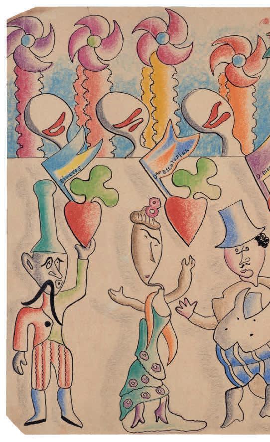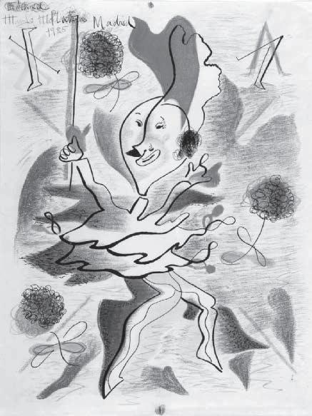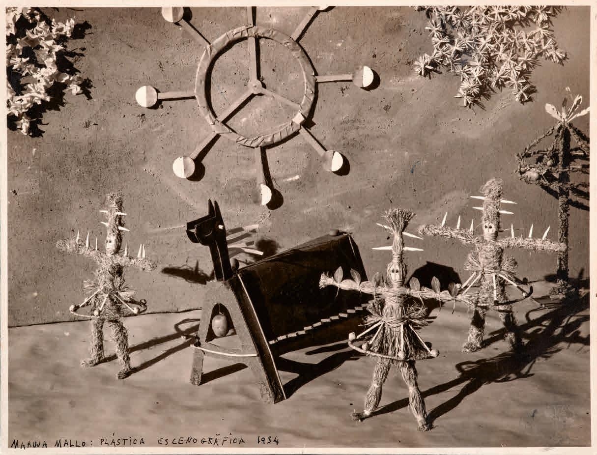 dirigidos por la escenografía volumétrica, que sustituía a los viejos decorados pintados. El autor no era ya el dramaturgo, sino el director de escena, como decía Lorca14, que al fin y al cabo no solo era escritor, también era músico y pintor. Su grupo ambulante La Barraca, compuesto por actores aficionados, fue el modelo de ese nuevo teatro, pero existieron muchos otros. Mallo colaboró desde 1927 en diversos proyectos con Concha Méndez y con Alberti, pero solo pudo ver representada una pieza con Méndez, de la que no han quedado bocetos ni fotografías. Sí se han conservado algunos dibujos para las obras de Alberti, entusiasta de los guiñoles de Vittorio Podrecca, que se presentaron en Madrid en 1924. Esos dibujos son caricaturas desenfadadas, pero revelan la importancia de un elemento, la iluminación, que Mallo consideraba esencial en el teatro y a la que dedicaría gran atención en su pintura de la etapa argentina. La artista traza las figuras, títeres de guante (de ahí su apariencia descoyuntada), disociándolas de las manchas de color, como si fueran proyecciones luminosas. Una técnica que también emplea en los dibujos sobre actores de cine cómico, que publicó en La Gaceta Literaria como ilustraciones para acompañar los textos de Alberti. En ellas, los cómicos aparecen representados, como decía con admiración Luis Gómez Mesa, no a través de sus retratos, sino de sus personajes: Chaplin en La quimera del oro (1925) o Charles R. Bowers en El inventor (1926), una sátira sobre la máquina. Por desgracia, su colaboración teatral más importante, la escenografía y los figurines de Clavileño (1935), un ballet de Rodolfo Halffter, no llegó a presentarse en la Residencia de Estudiantes debido al inicio de la Guerra Civil. Las fotografías de las maquetas del escenario y los figurines que incluyó en su exposición de 1936 en ADLAN nos permiten entender la radicalidad de su propuesta, que renuncia a los decorados pintados y fijos para crear un dispositivo espacial dinámico a través de los figurines y de la iluminación. El nombre de Clavileño hace referencia a una de las aventuras de la segunda parte del Quijote, en la que unos nobles de la corte embroman al Quijote y su escudero, convenciéndoles de que suban a un caballo que les llevará al cielo, para romper el encantamiento hecho por Merlín a unas damas. Las maquetas de los figurines son máscaras de cuerpo entero, estructuras cónicas rígidas en el caso de los nobles, revestimientos de esparto, paja, lana y trigo en el de los menestrales. Recuerdan también a los figurines del Ballet triádico (1922) de Oskar Schlemmer, que se reprodujeron en las páginas de La Gaceta Literaria, y sobre todo a los hommes-décor de Picasso para los Ballets Rusos, figuras que son a la vez vestuario y decorado, y que al moverse bajo luces de colores construyen un espacio móvil. Mallo preparó un texto, el primero que publicó para explicar sus intenciones, en el que defendía la idea del actor o bailarín como esqueleto mecánico15. Es decir, como “supermarioneta” que basa su expresividad en el movimiento y no en el gesto ni en la palabra, siguiendo las ideas de Edward Gordon Craig, sobre cuyas teorías había publicado Rafael Dieste un ensayo en 193516