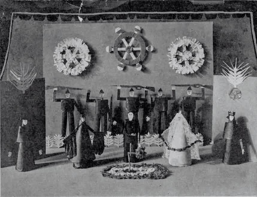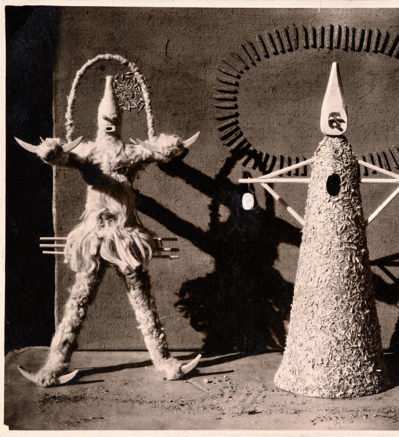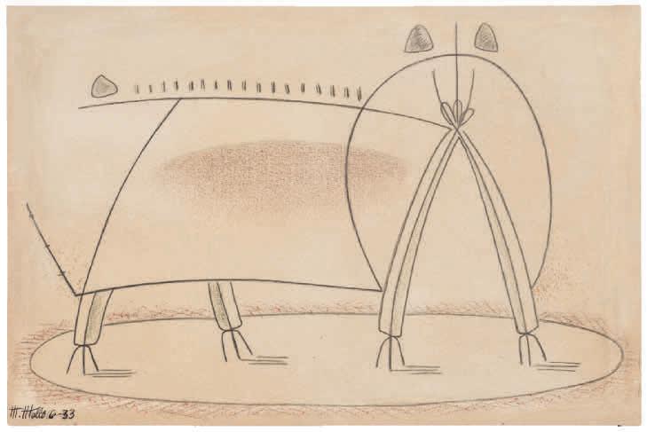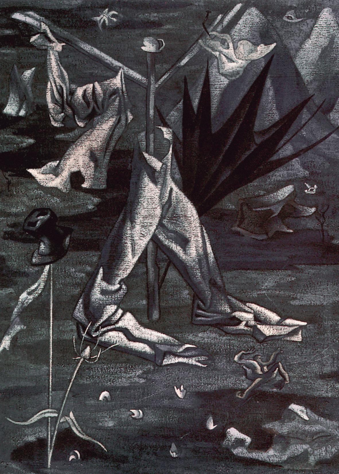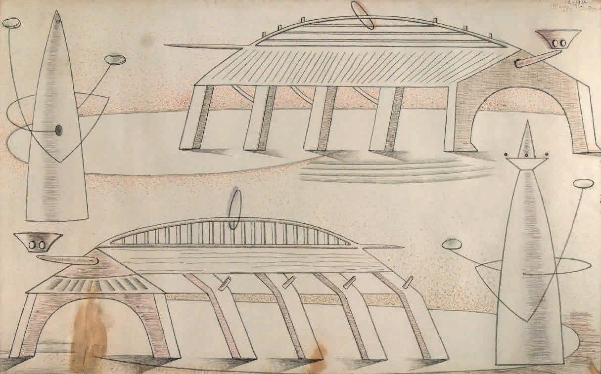 Este trabajo teatral de Mallo lleva al extremo la estética concreta, que habían anunciando las Arquitecturas minerales y las Arquitecturas vegetales de 1933, inspiradas en los rasgos materiales del paisaje, y las Construcciones rurales de 1933-1936. En las primeras llega a un sutil equilibrio entre el dibujo, casi reducido a la silueta, y las variadas texturas matéricas, aplicadas tan generosamente que se convierten en protagonistas. En sus palabras: “la cosa formal, sin perderse, queda un poco anulada por la fuerza de las materias que la componen”17. En las Construcciones rurales dibuja esqueletos o carcasas de silos, almiares y otras arquitecturas básicas y efímeras utilizadas para la cosecha de cereales. Ambas series indican su interés por la construcción como premisa del arte, pero también de la naturaleza y de ese estadio intermedio que son las construcciones campesinas. Esas series muestran el interés y la capacidad de la artista para partir de la realidad cercana y llegar a lo que ella consideraba abstracción, es decir, la creación de imágenes mentales que provienen de sugerencias