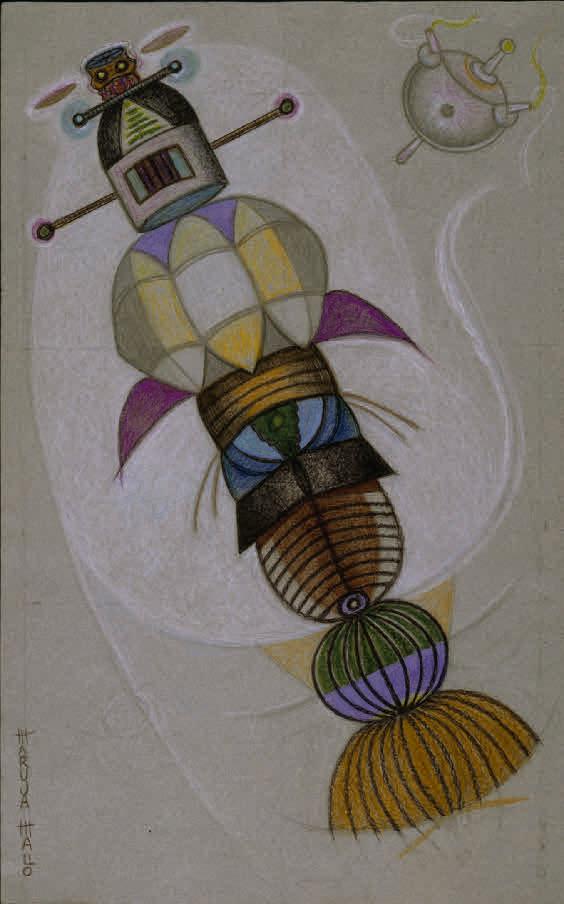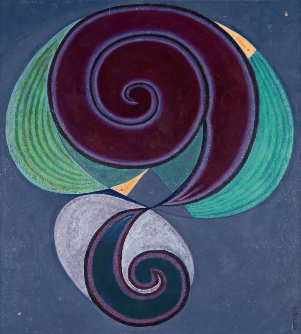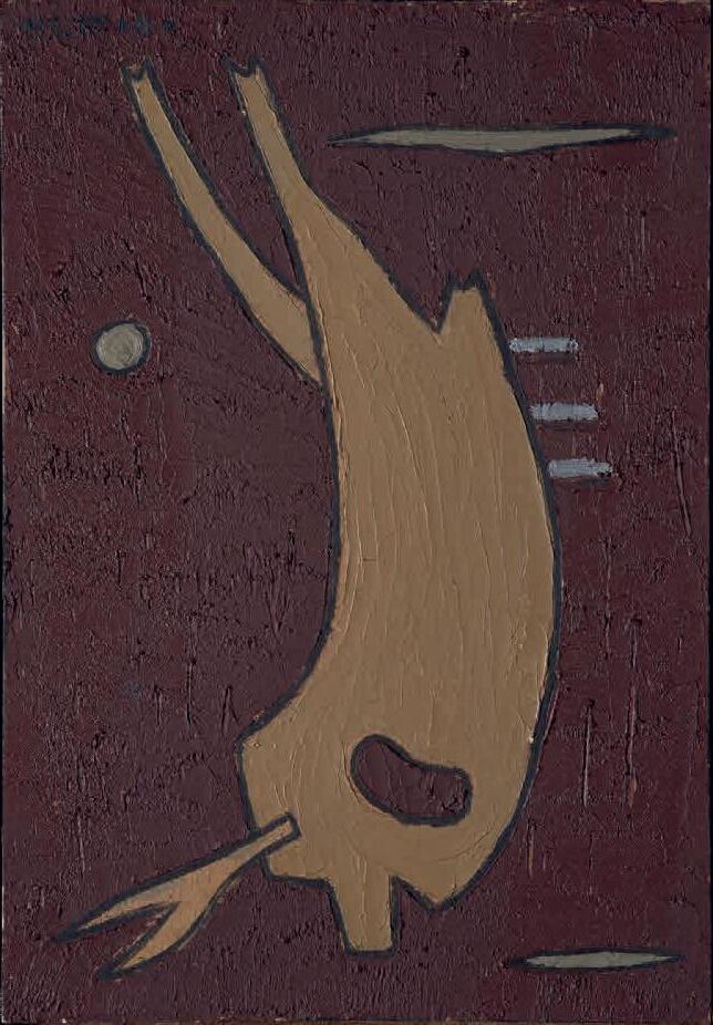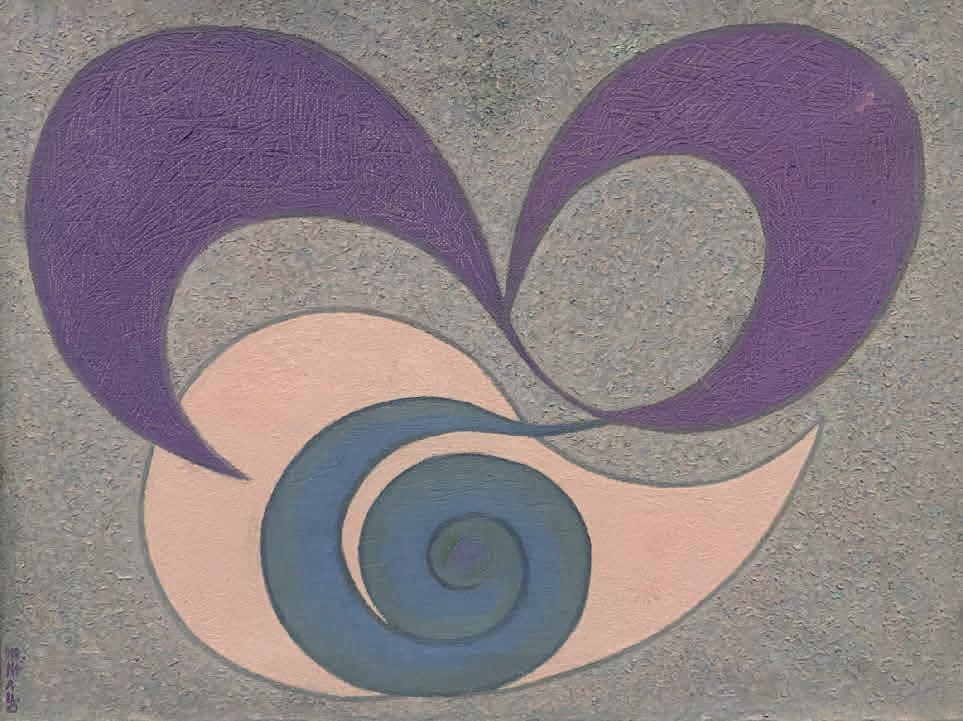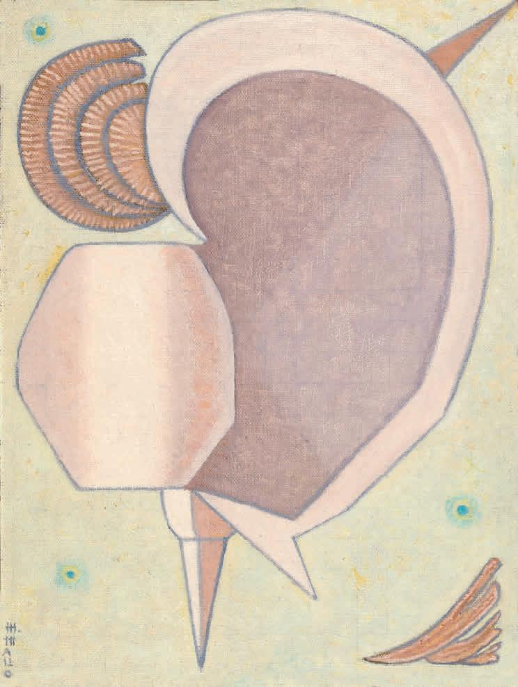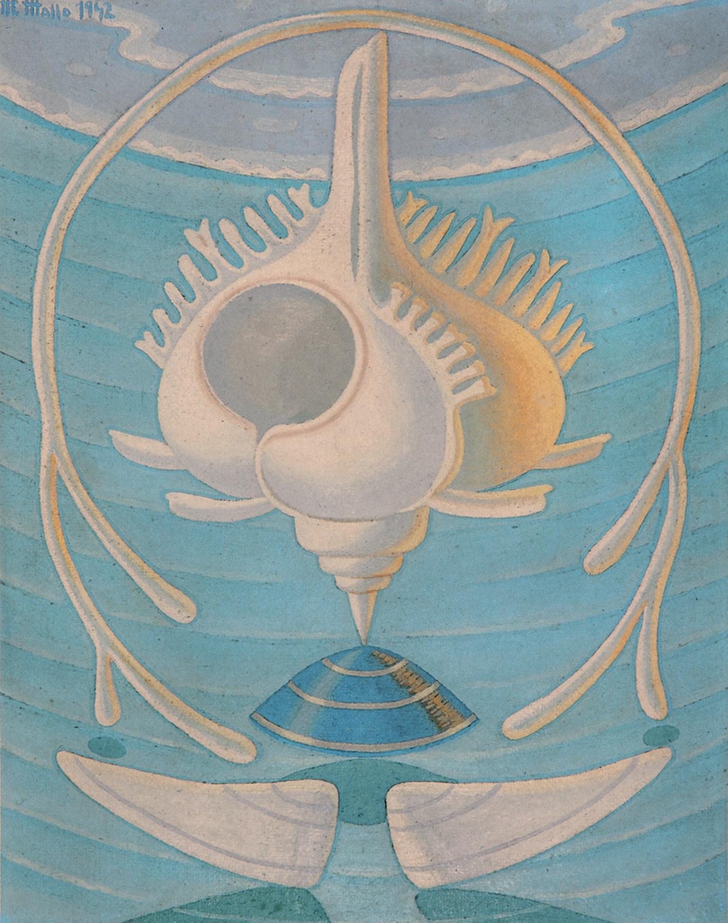 In 1937, Mallo had to leave Spain, embarking on an exile in Buenos Aires that would last more than two decades. In her own words, during that time her interest shifted “from geography to cosmography” and science became a central theme of her work. Mallo abandoned the radical formal and thematic ruptures of her early career to dive deeper into her previous areas of research. An example of this is Naturalezas vivas (Living Natures), where shells and flowers evoke female figures; Cabezas de mujer (Heads of Women), in which the symbiosis between the plant, animal, and human kingdoms leads to a hybridization of genders and races; or the Máscaras (Masks) and Acróbatas (Acrobats) series, complex studies exploring color, shadow, and movement. Meanwhile, Moradores del vacío (Dwellers of the Void) or Viajeros del éter (Ether Travelers), two projects initiated in the late 1950s, showcase Mallo’s interest from this point on in the fourth dimension of space-time.