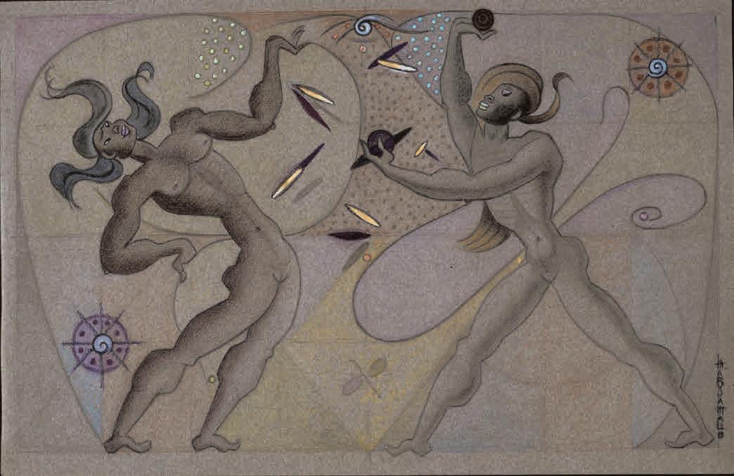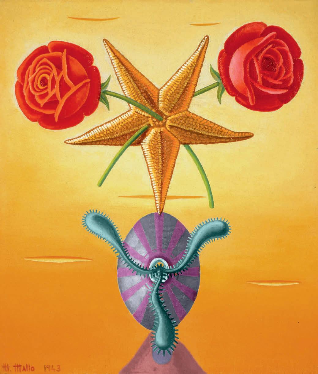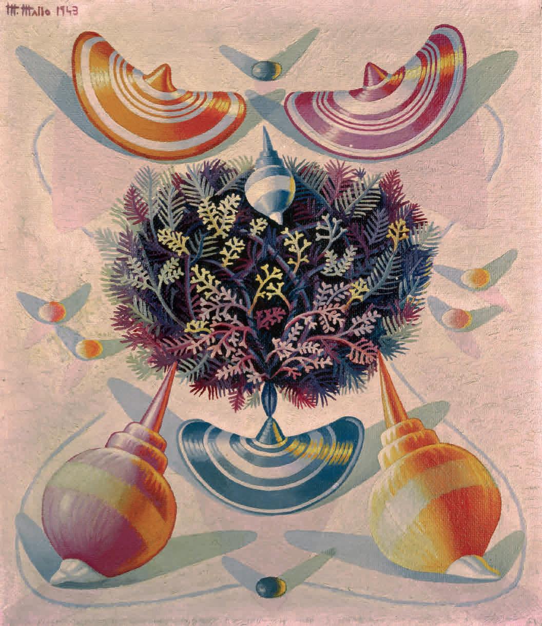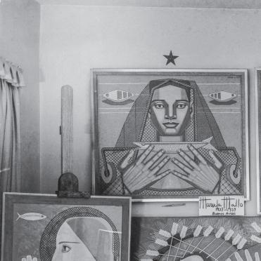 compositions of shells and flowers that clearly and sensually suggest female sex organs ( Naturalezas vivas [Living Natures], 1941–43). Focusing on a necessary rejection of Cartesian dualism (which divorces the mind from the body) and a critique of the prevailing dichotomous separation of nature and culture, researcher Alejandra Zanetta recounts Mallo’s intention to use her painting to build “a mythology for a new order.” This new order was designed to be fairer and more harmonious, focusing on the modern, working, and independent woman and embracing the materiality of the body as the source of all experience, a body inseparable from the natural and material world. Zanetta, who has previously explored the telluric and mythological connections in the painter’s work, offers us a different perspective on how the syncretism of Afro-Uruguayan and Afro-Brazilian religions that Mallo discovered during her exile in Argentina influenced her production. Zanetta also focuses on Mallo’s final years, in which the artist’s faith in human transcendence expanded hand-in-hand with her knowledge of contemporary technological advances and her interest in cosmic energy, themes that are reflected in the series Viajeros del éter (Ether Travelers) (1982).