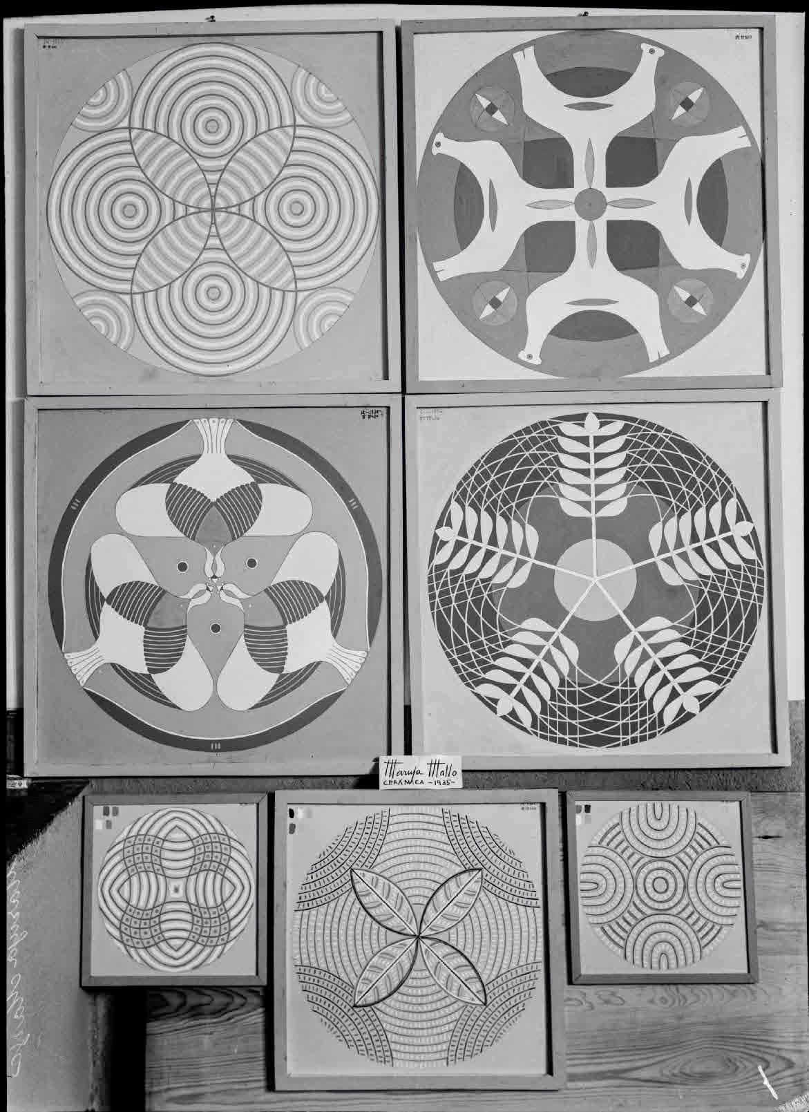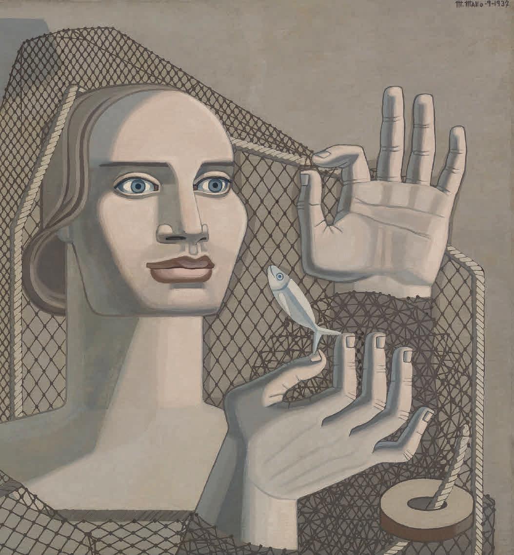 En ese año ella misma usó sus manos para modelar un conjunto de cerámicas —dos series de platos—, un encargo de la Escuela de Cerámica de Madrid, cuyo director, Francisco Alcántara, le había pedido que orientara creativamente a sus alumnos. En una serie retomó las figuras populares y en la otra partió de la geometría circular de los propios platos, combinando diversos patrones abstractos o sintetizando figuras de la naturaleza con un fuerte simbolismo numérico y mítico. Se trata de composiciones triangulares, pentagonales y, sobre todo, circulares, las formas platónicas perfectas que ella había estudiado con atención en el libro de Matila Ghyka Estética de las proporciones en la naturaleza y en las artes (París, 1927). A diferencia de otros artistas de la abstracción que usaron la trama abierta en sus composiciones, Mallo prefirió la forma cerrada del círculo, cuyas implicaciones formales y simbólicas son muy distintas. En Ghyka encontró la artista un sistema geométrico y matemático para sus composiciones y, además, la idea de que el arte de todas las épocas y la naturaleza compartían ese sistema. Las manos se repiten en los dibujos que realizó ese verano en Galicia, y que le servirían como base para sus primeras obras americanas, en las que aplicó las enseñanzas de Ghyka en lo que llamó sus trazados armónicos, composiciones geométricas previas a los dibujos de sus figuras. Se despidió de la poética vallecana con esas imágenes, tan afines a los versos de “Las manos” que Miguel Hernández escribió en 1937: “La mano es la herramienta del alma, su mensaje. [...] Ante la aurora veo surgir las manos puras / de los