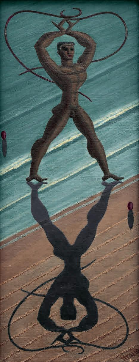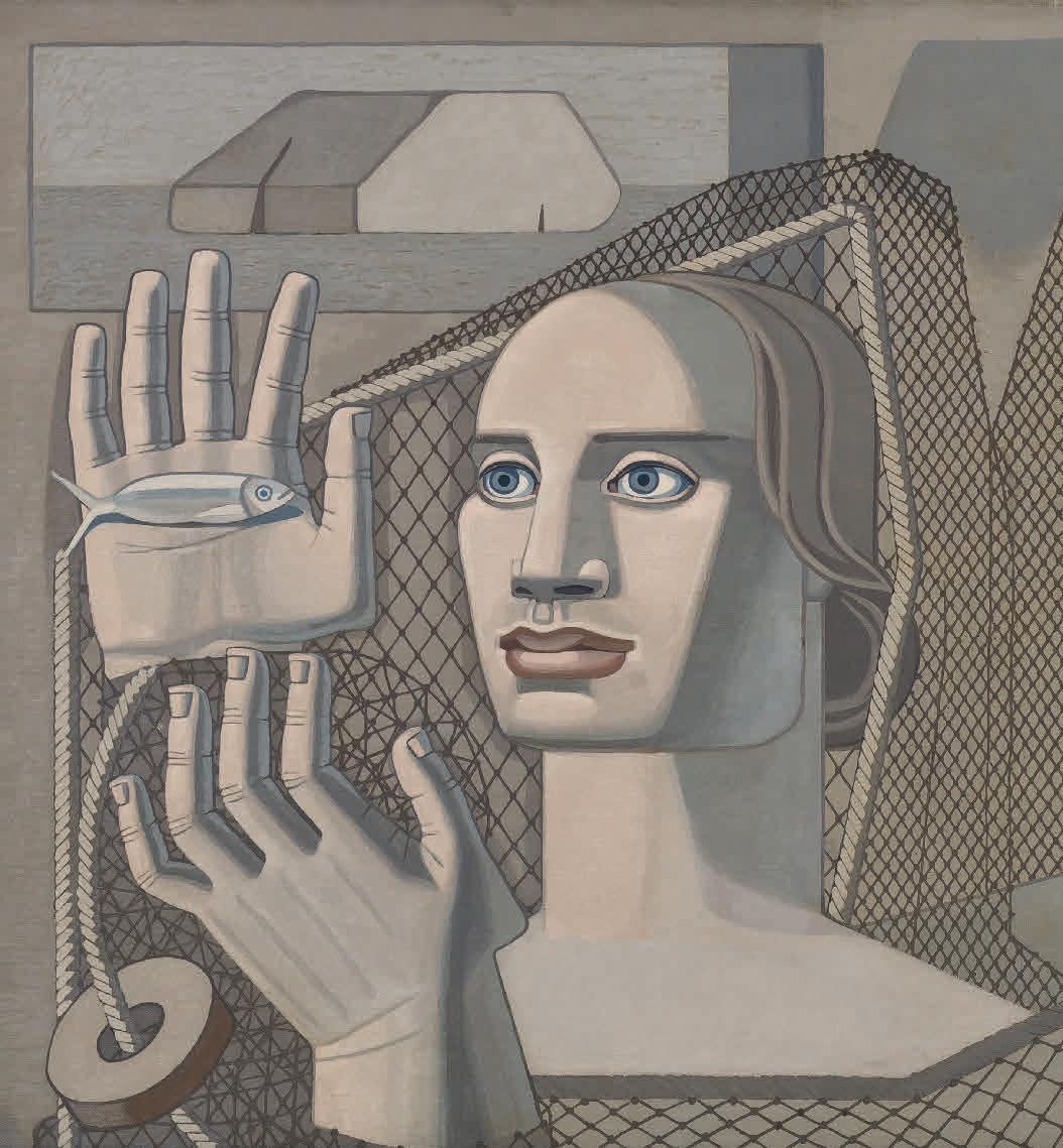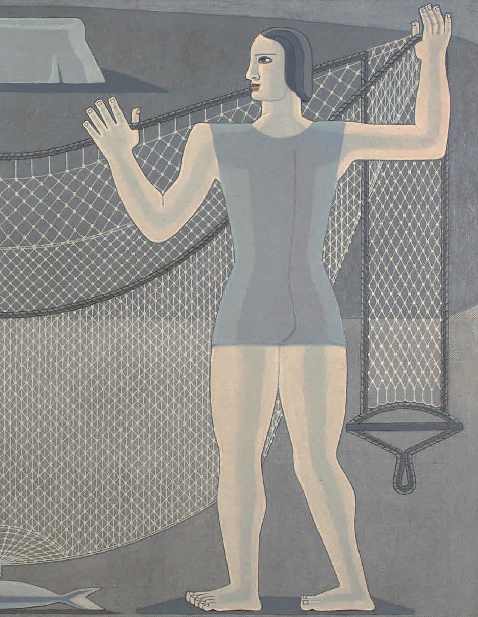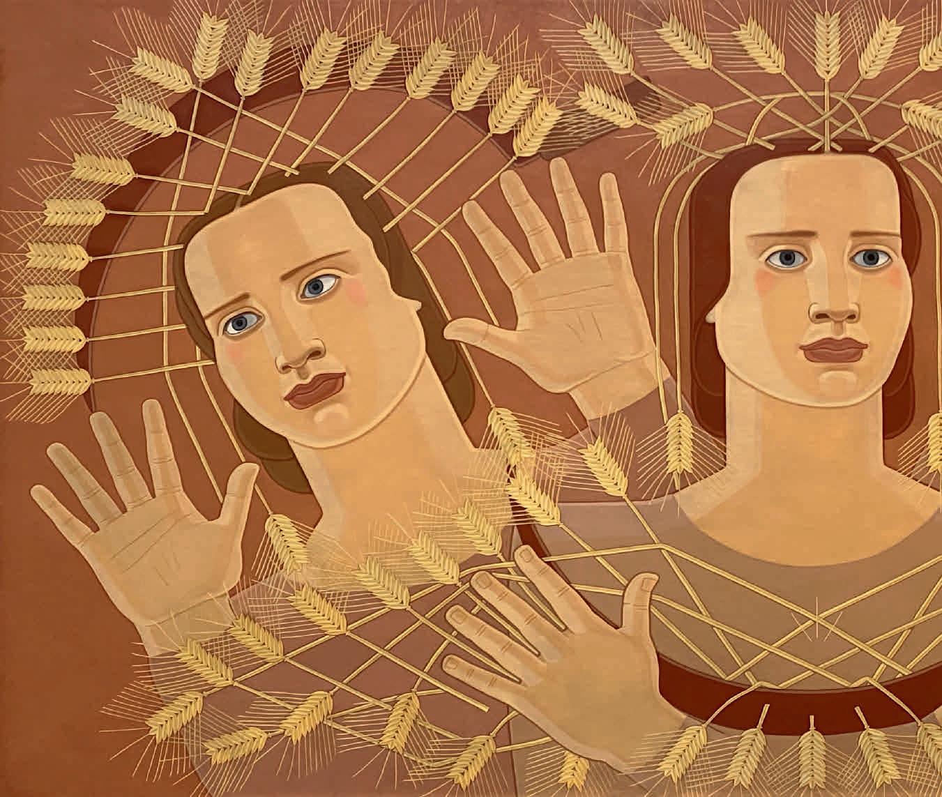 This symbiotic correspondence between the bodies of women (imagined by the artist as androgynous goddesses) and the natural world is recurrent in Mallo’s work, from the deities sprouting ears of wheat from their hands in Canto de las espigas (Song of the Wheat Spikes) (1939) and the maidens offering nets and fish in Figuras (Figures) (1937) to the