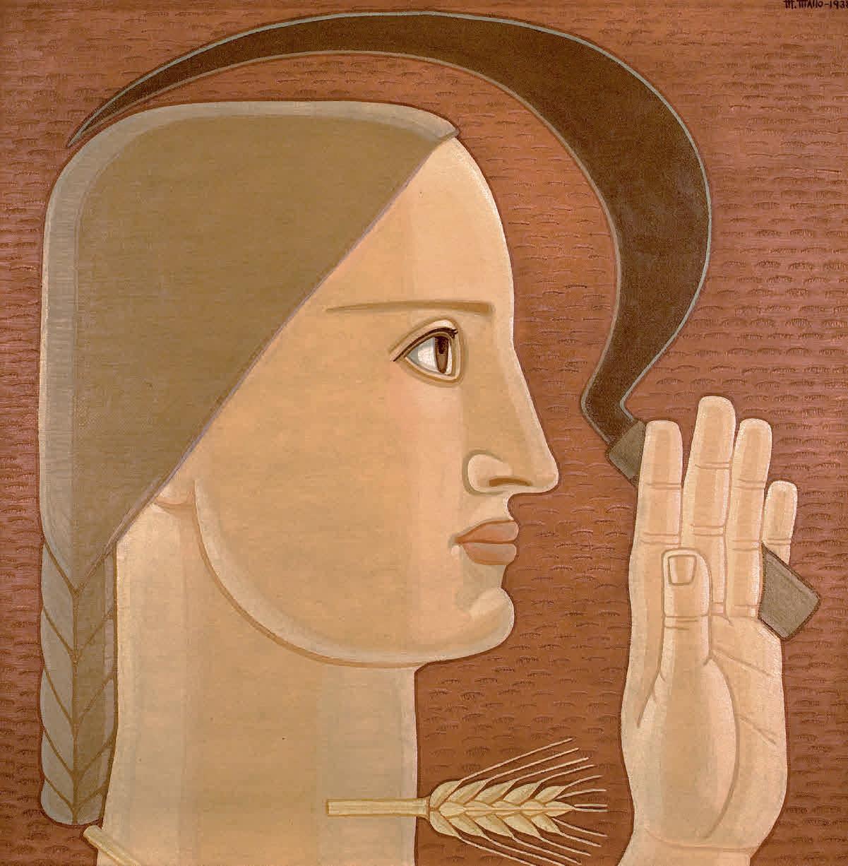 trabajadores terrestres y marinos”. Una postal del crítico de teatro uruguayo René Arturo Despouey, dirigida desde Soria en 1935 a Benjamín Palencia, con recuerdos para Mallo y para Luis Castellanos, resume bien ese espíritu del grupo en que geometría, mística y vuelta a la época preindustrial y a la tierra —incluso al barro de la cerámica— se ven como escenario de libertad frente a la alienación del trabajador sometido a la cadena de montaje: “En Numancia hay una verdad plástica de cacharros; pura geometría que admira su intimismo con otra verdad de resonancias cósmicas muy siglo xI y xII […]. Desde los 4 puntos cardinales se levanta la voz que reclama por la reivindicación del hombre”20. Además, cita dos obras de teatro del momento, en las que obreros y campesinos se revuelven contra la máquina. Es la etapa más política de Maruja Mallo, cuya última pareja en España fue un líder sindical del Partido Obrero de Unificación Marxista (POUM). Pero 1936 es también el año de consagración de la pintora. Muestra su obra en la Exposició Logicofobista de Barcelona, que reúne a artistas cercanos al surrealismo; en la exposición L’Art Espagnol Contemporain de la Galerie nationale du Jeu de Paume, que adquiere una Verbena para su colección de artistas extranjeras; y en la Bienal de Venecia. Presenta sus últimos trabajos, las arquitecturas, las escenografías y las cerámicas, en una individual en ADLAN. Por fin va a conseguir que su obra salga del caballete y pase al espacio y la producción. Se fotografía junto a sus cuadros, las cerámicas, los figurines y la Sorpresa del trigo, colocando como atrezo simbólico un mapa de España, unas vasijas populares, sosteniendo una espiga en sus manos y vistiendo una bufanda de cuadros —geometría y naturaleza—. Se siente tan segura que se atreve a enfrentarse públicamente a Juan de la Encina, por su reseña en El Sol, con una carta dirigida al periódico (p. 182). En ella, Mallo defiende la seriedad de su trabajo y reprueba, con su típica ironía, la superficialidad de la crítica, centrada en su aspecto físico.