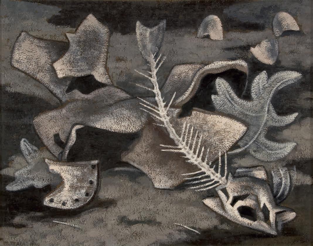 En su nota de archivo sobre sus obras de esos años, las describe como “Despojos, huellas, muertos, esqueletos”, y las relaciona con la muerte y con la influencia surrealista —también con lo que llama la tragedia, su separación de Rafael Alberti—. Si las Verbenas recogían la humanidad vital, aquí Mallo desciende a los infiernos para representar la cara contraria de la vida, sus despojos acogidos por la tierra baldía. En 1932 viajó a París, una estancia que aprovechó para conocer a sus admirados Picasso y Miró, y para exponer esta serie, junto a algunas Estampas, en la galería Pierre, núcleo surrealista que le permitió conocer entre otros a André Breton, quien le compró uno de los cuadros. Su carrera seguía en ascenso. En París estudió escenografía. El teatro se había convertido en un asunto favorito de artistas y escritores, que se encontraban en busca de un arte nuevo que respondiera a su necesidad de abandonar la pintura de caballete para llevarla al espacio, y conseguir nuevos públicos. Las reflexiones sobre el teatro eran frecuentes incluso en las revistas populares de la época, que daban cuenta de la visita de Vittorio Podrecca con su guiñol o de Anton Giulio Bragaglia como conferenciante. El teatro fue una de las actividades más experimentales en los años treinta, en la que los artistas participaban como configuradores de un espectáculo total en el que la música y la iluminación eran tan importantes como los actores, cuyos movimientos estaban