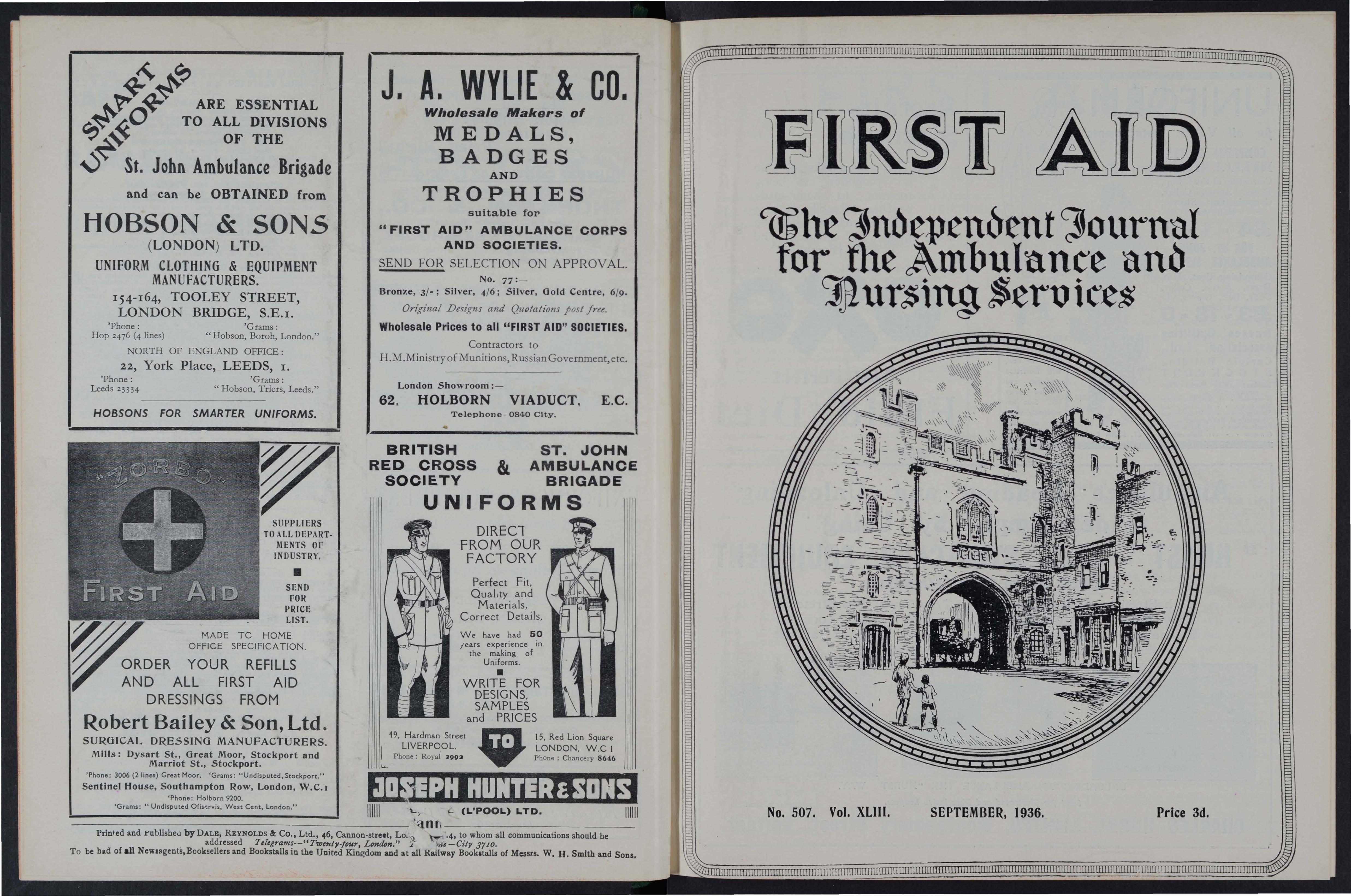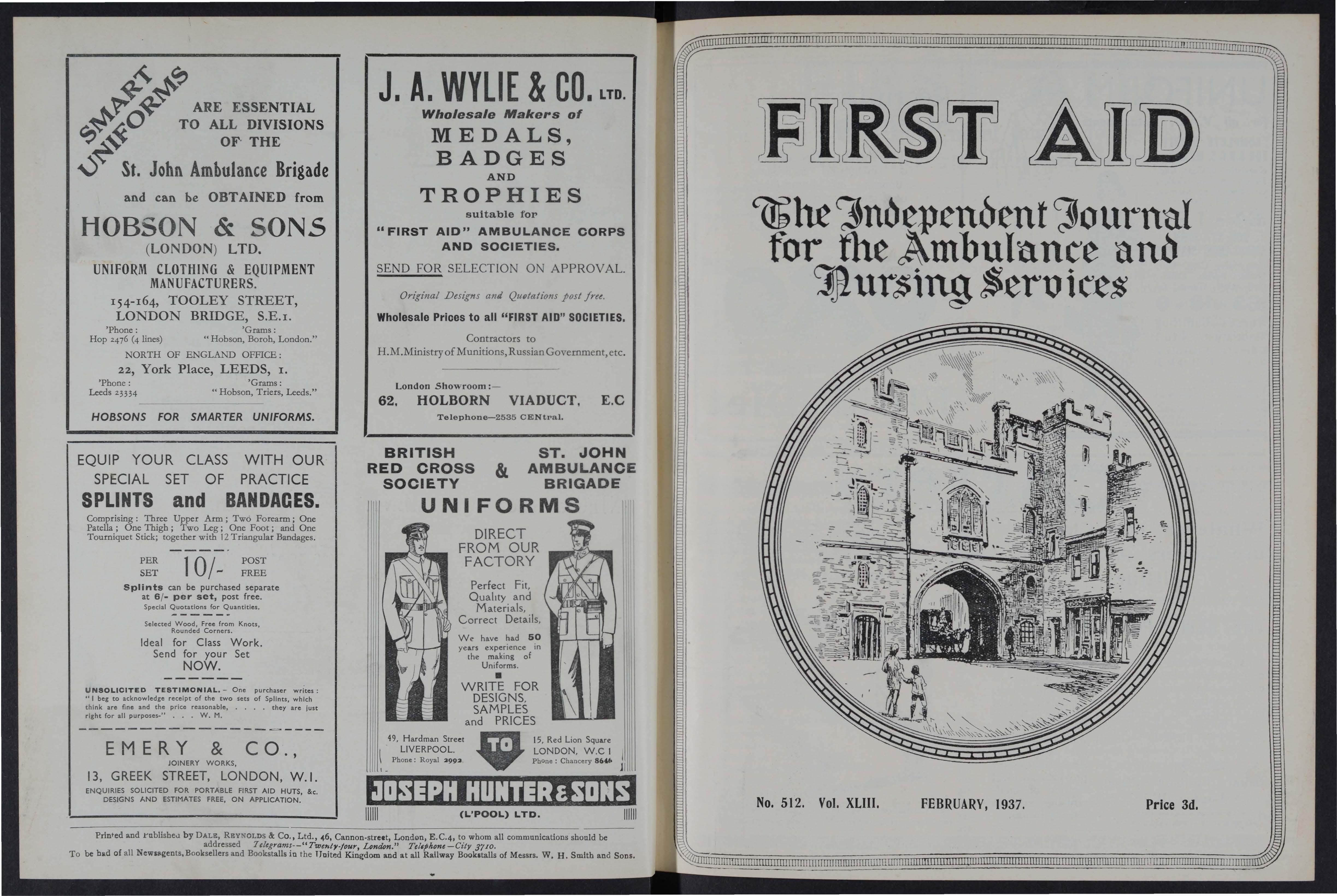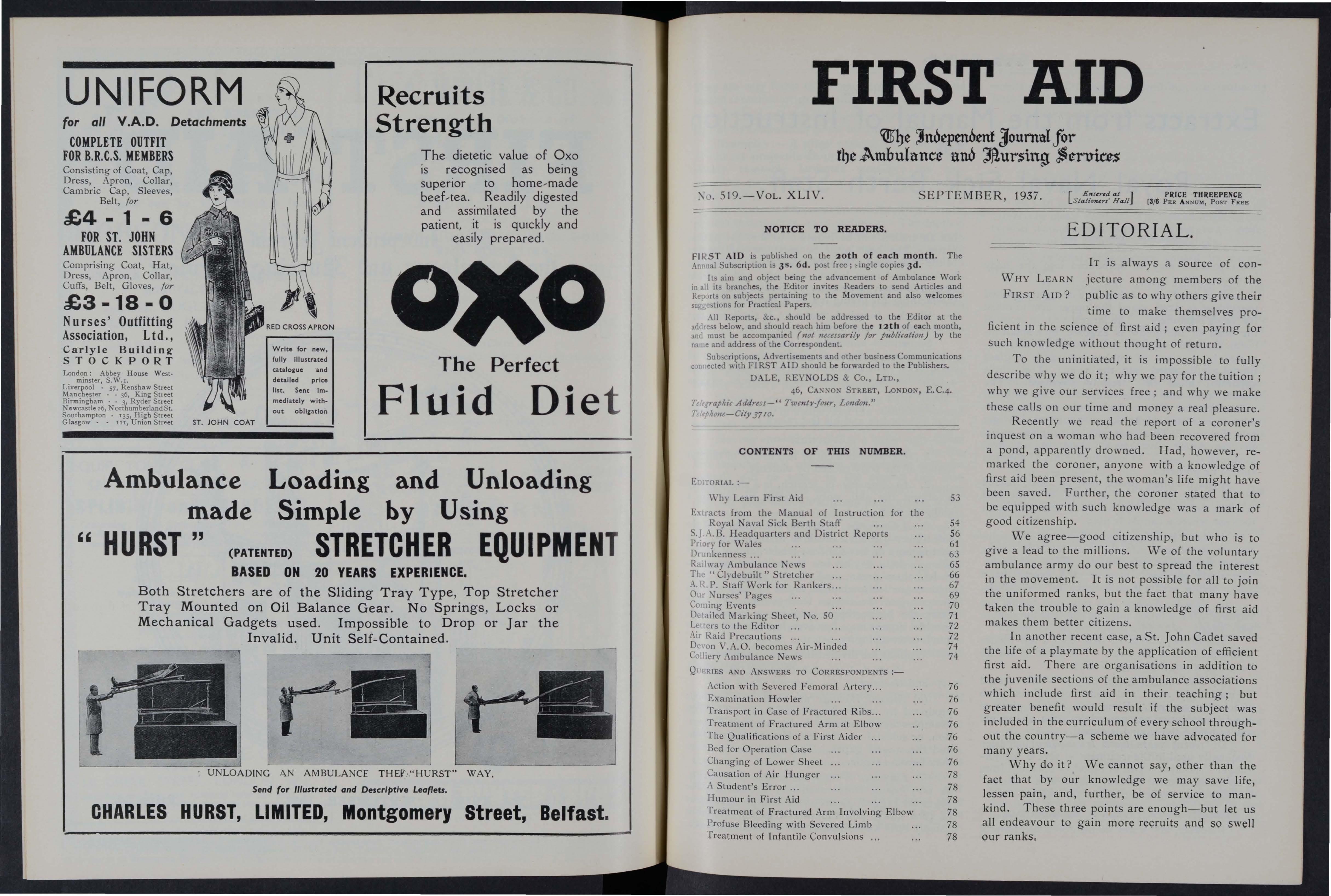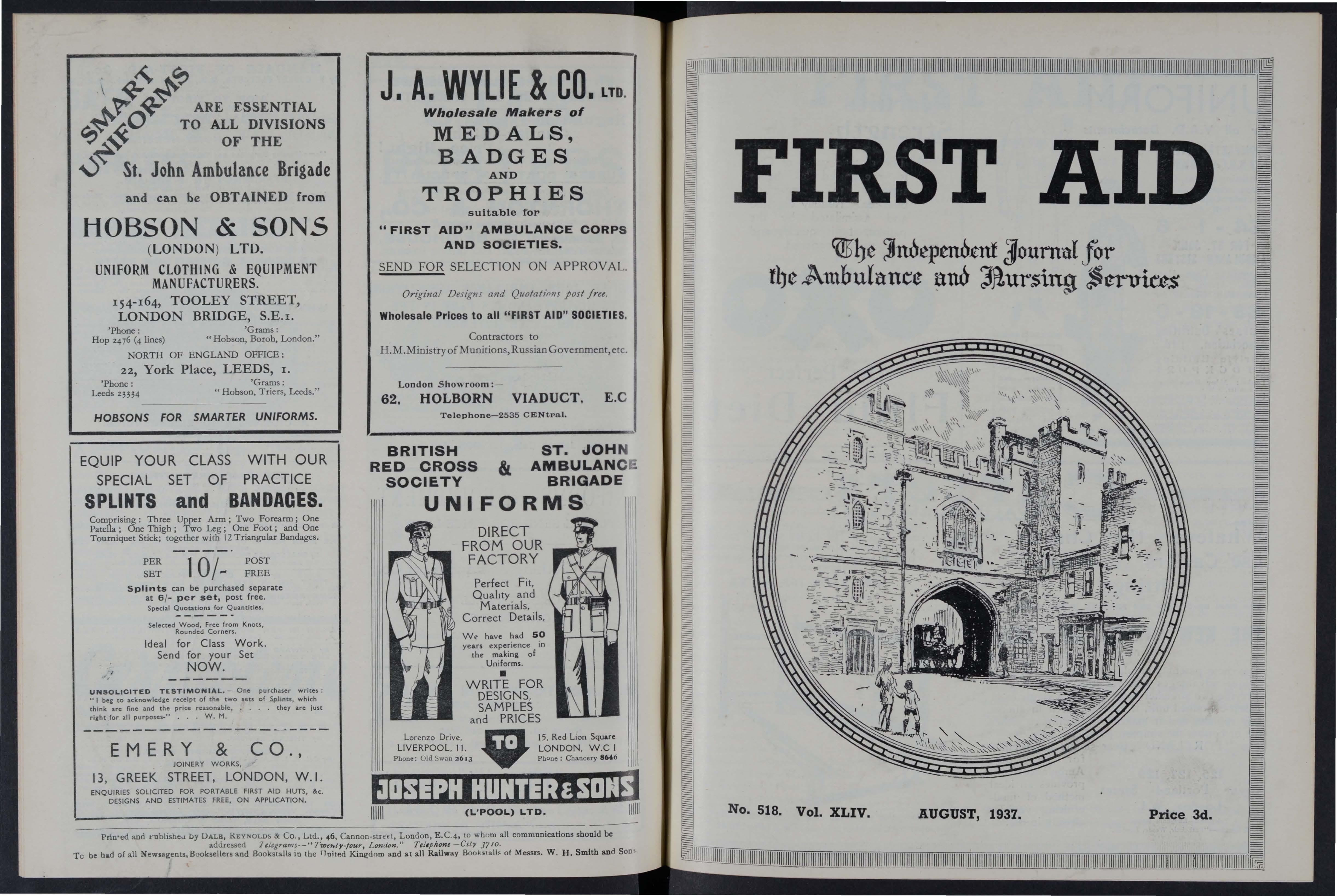 FIRST AID The Independent Journal for the Ambulance and Nursing Services. VOLUME XLIII. (No. 505, July, 193 6, to No 5 16 , June, 1937). LONDON: DALE, REYI\OLDS & CO., LTD., 46, CANNON STREET, E.C 4.
