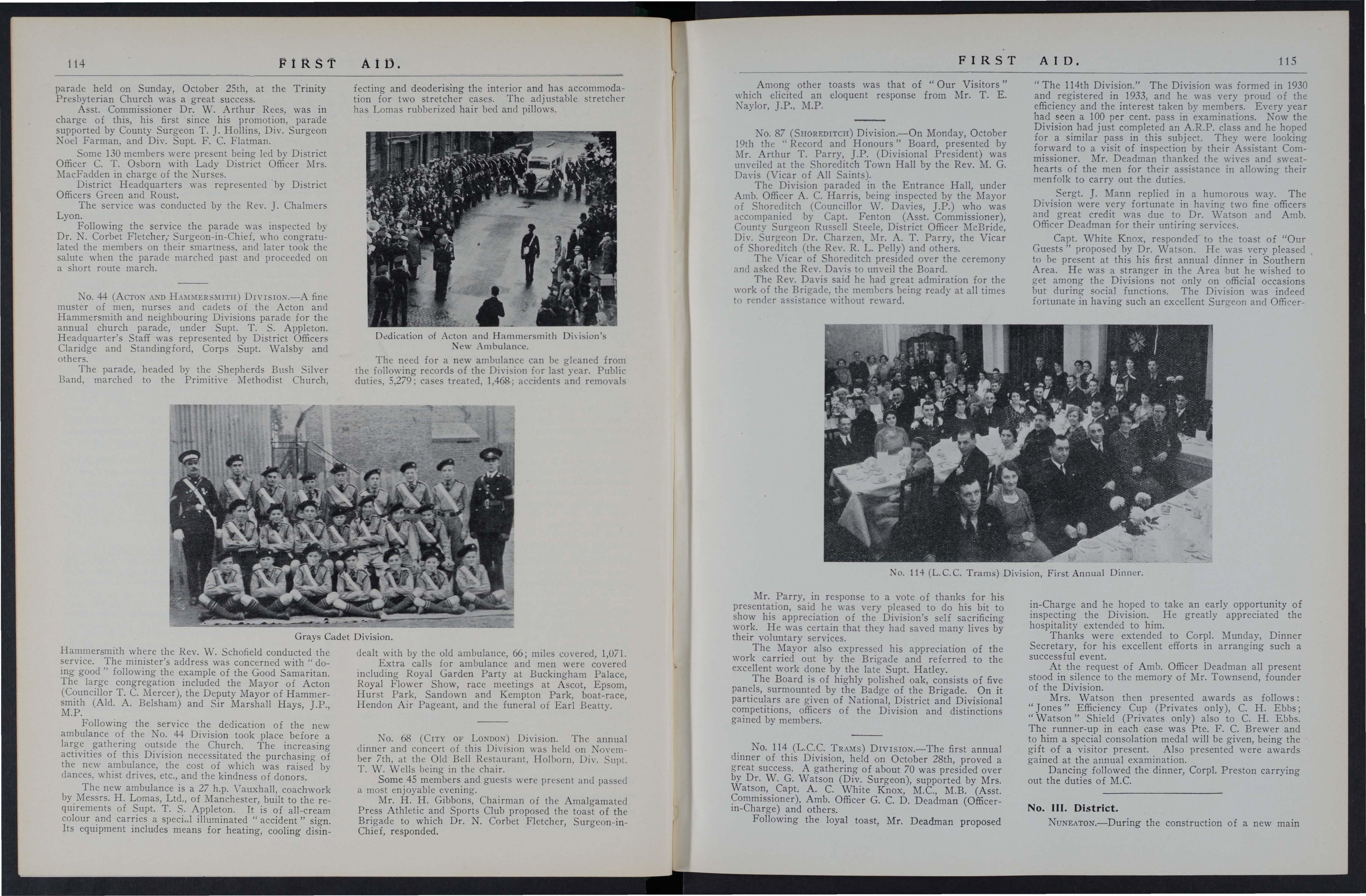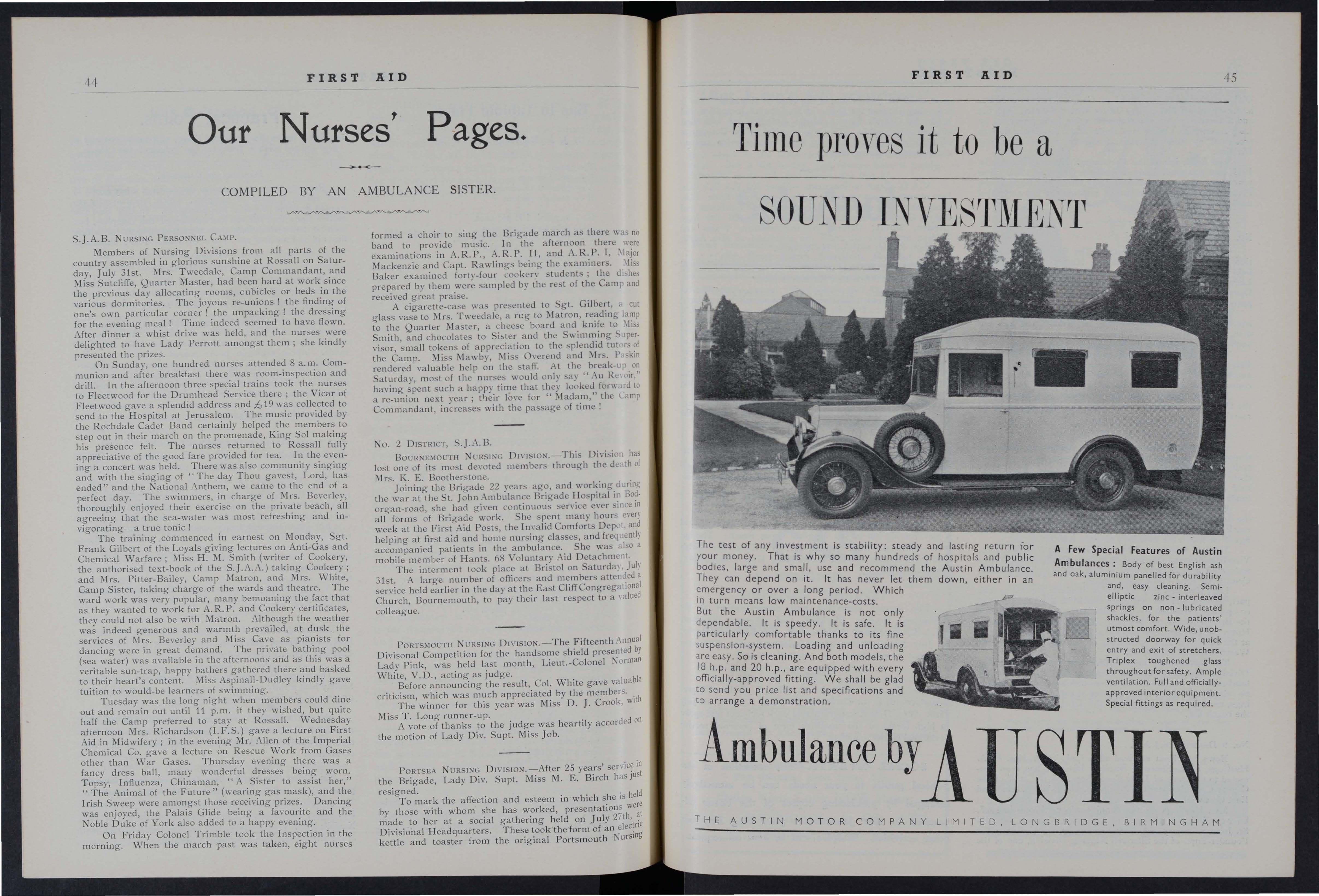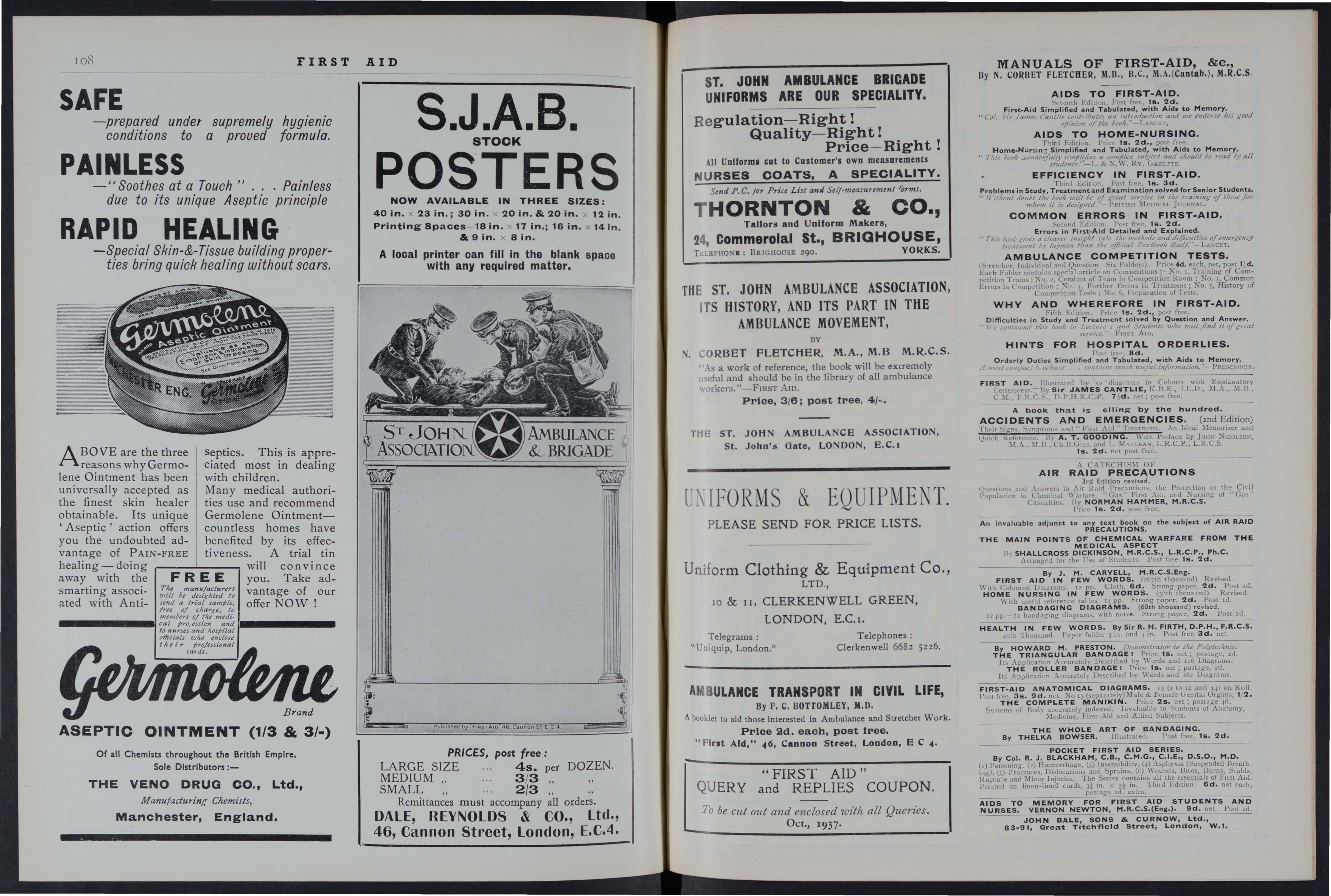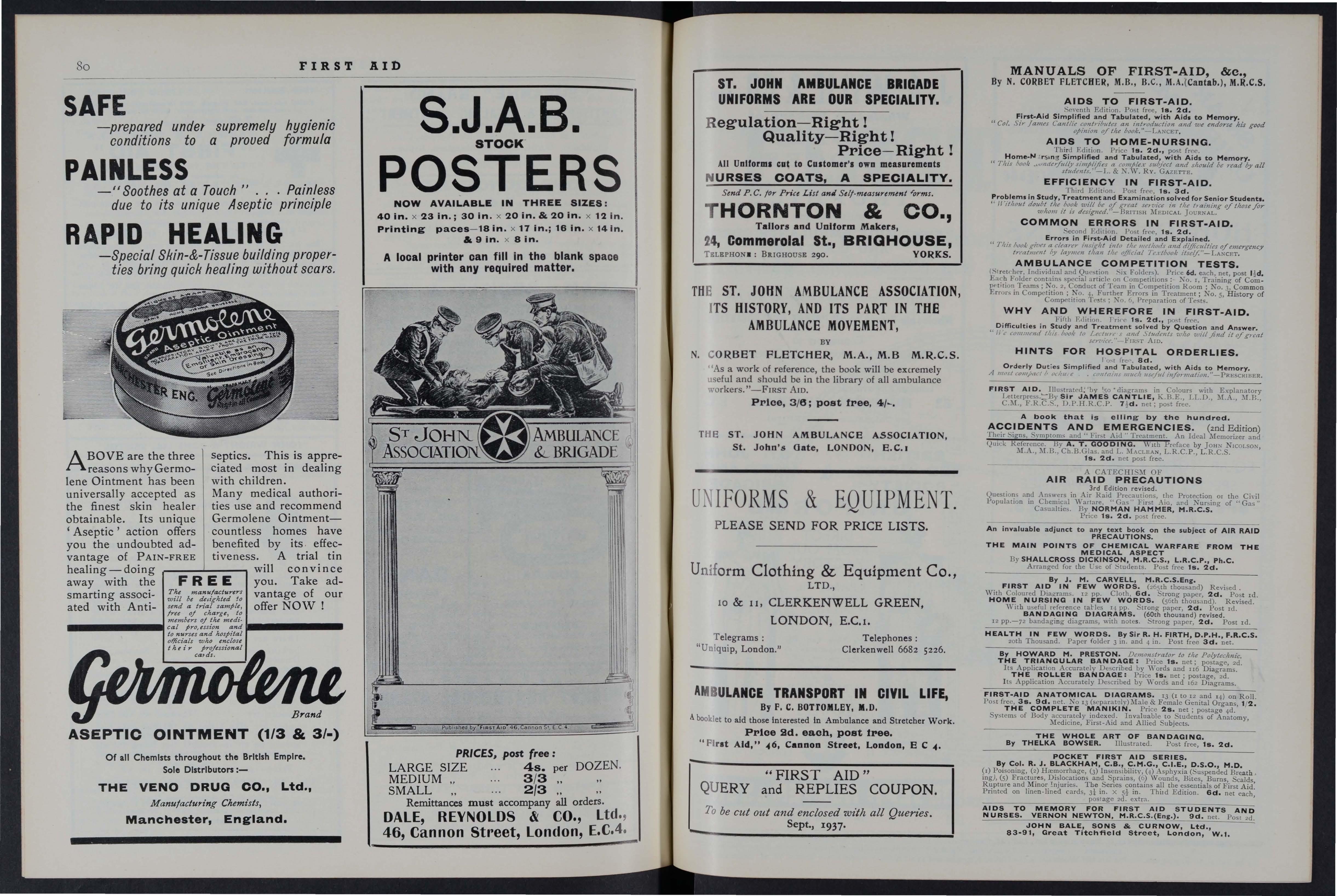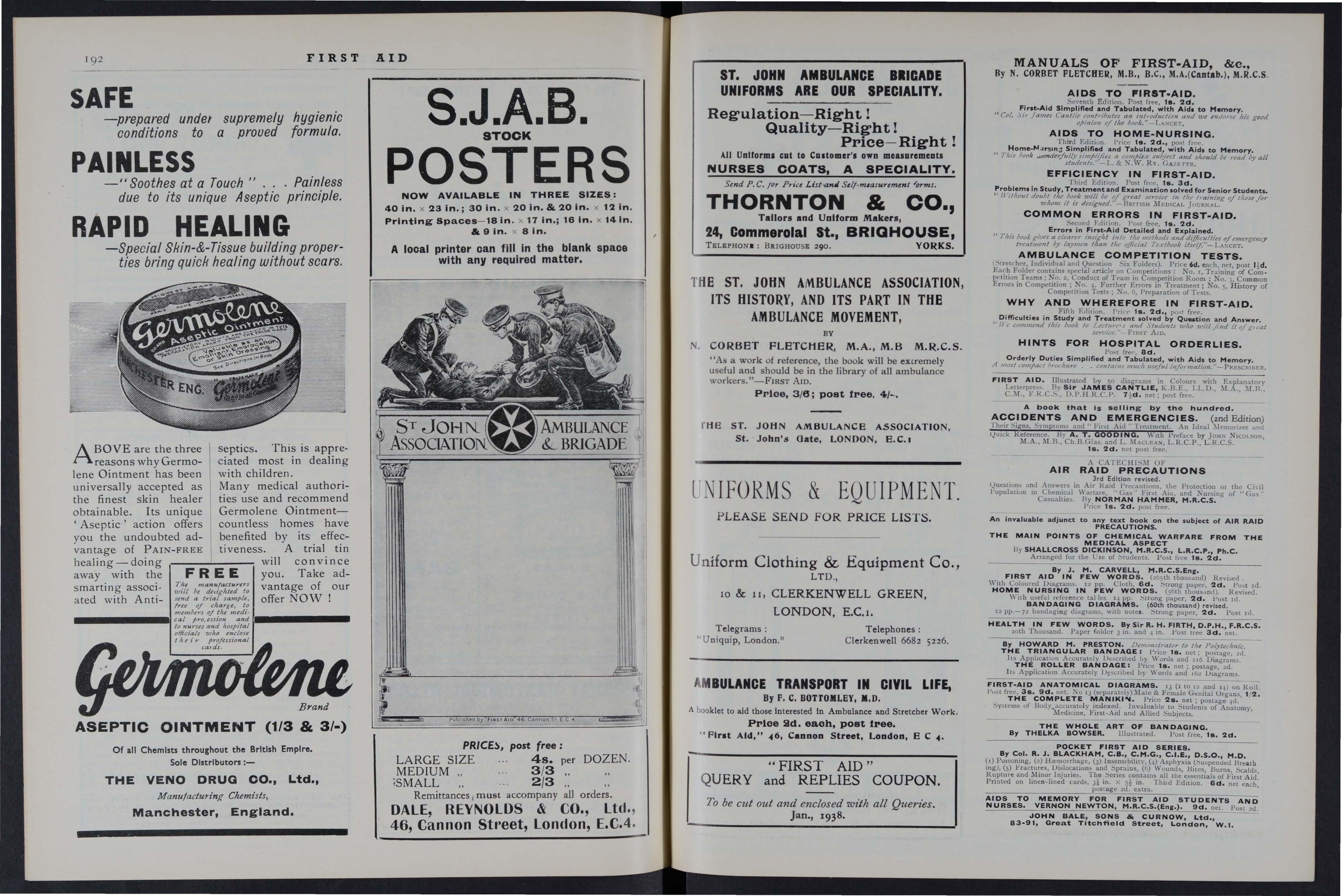 NOW AVAILABLE IN THREE SIZES: 40 in. x 23 in.; 30 in. x 20 in. &. 20 in. x 12 in. Printing Spaces - 18 in. x 17 in.; 16 in. x 141n. A 9 in. x 8 in. A local printer can fill in the blank space with any required matter. .! post free: LARGE SIZE 48. per DOZEN. MEDIUM " 3/3 SMALL 2/3 " Remittances must accompany all orders. DALE, REVNOLDS & CO., Ltd., 46, Cannon Street, London, E.C.4. ST. dOHN UNIFORMS AMBULANCE BRICADE ARE OUR SPECIALITY. Regulation-Right 1 Quality-Right 1 Price - Right All Uoiform. Gut to Customer ' , own measurements NURSES COATS, A SPECIALITY. Send P. C (Or Pr ce List anti Set/.m ea surement THORNTON co., Tailors and Uniform Makers , 24, Commerolal St•• BRIQHOUSE, TRLK rH O N a : B RI GH OUS K 29 0 THE ST. JOHN AMBULANCE ASSOCIATION, ITS HIS rORY, AND ITS PART IN THE AMBULANCE MOVEMENT, BY N. CORBET FLETCHER, M.A., M.B M.R.C.S "As a w o rk of r der e n ce , t h e boo k w ill be ex cremely lseful and s h o uld be i n h e li b r a r y of all am bulan ce wo rk ers. "- FI RST AlD. Pr1ce, 3 /6; post tree . 4 ,-. THE ST. JOHN AMBULANCE ASSOCIATION, St. John's Gate, LONDON, E.C •• UNIFORMS & EQ UIPMENT. PLEASE SEND FOR PRICE LISTS. Uniform Clothing & Equipment Co., LTD , 10 & 11, CLERKENWELL GREEN, LONDON, E.C.l Tel e gr a ms T e leph un e :> : Unlqu ip, Lo ndon ." Cle r ken well 66 82 5226