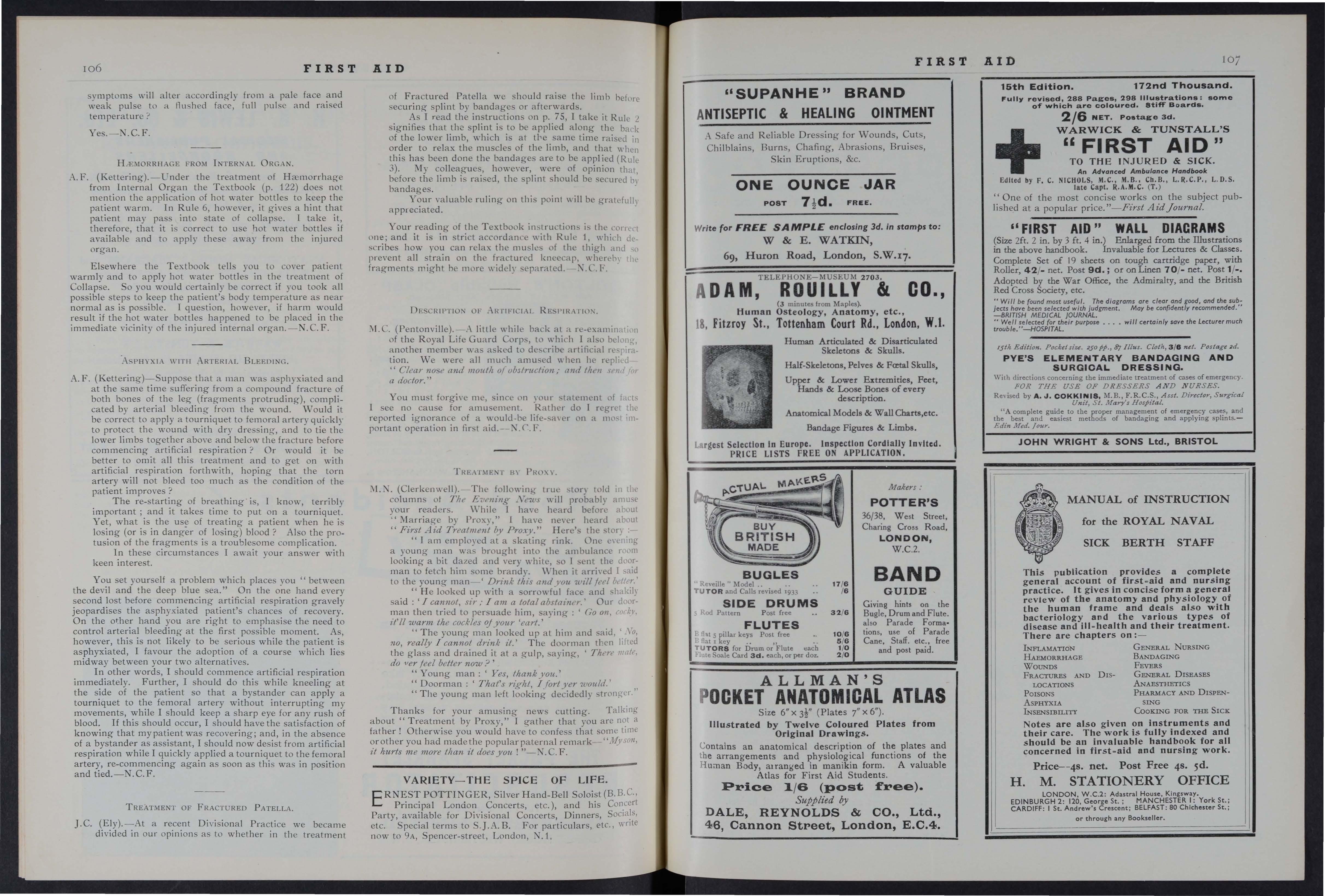 Th e o pinion h e ld by ce r ta in m e m bers of t h e cesto n D v s io n , S.]. A. B. , is that th ese co n t r a di cto r y statements are li kel y to ca u se confus io n amo n g first aide r s So you r ki nd reply will n o doubt be a\\'a ite d with n terest by t h ose m em b ers of the B R. C. S. an d of the :3 .]. A. B. who a r e readers of FIRST AID.