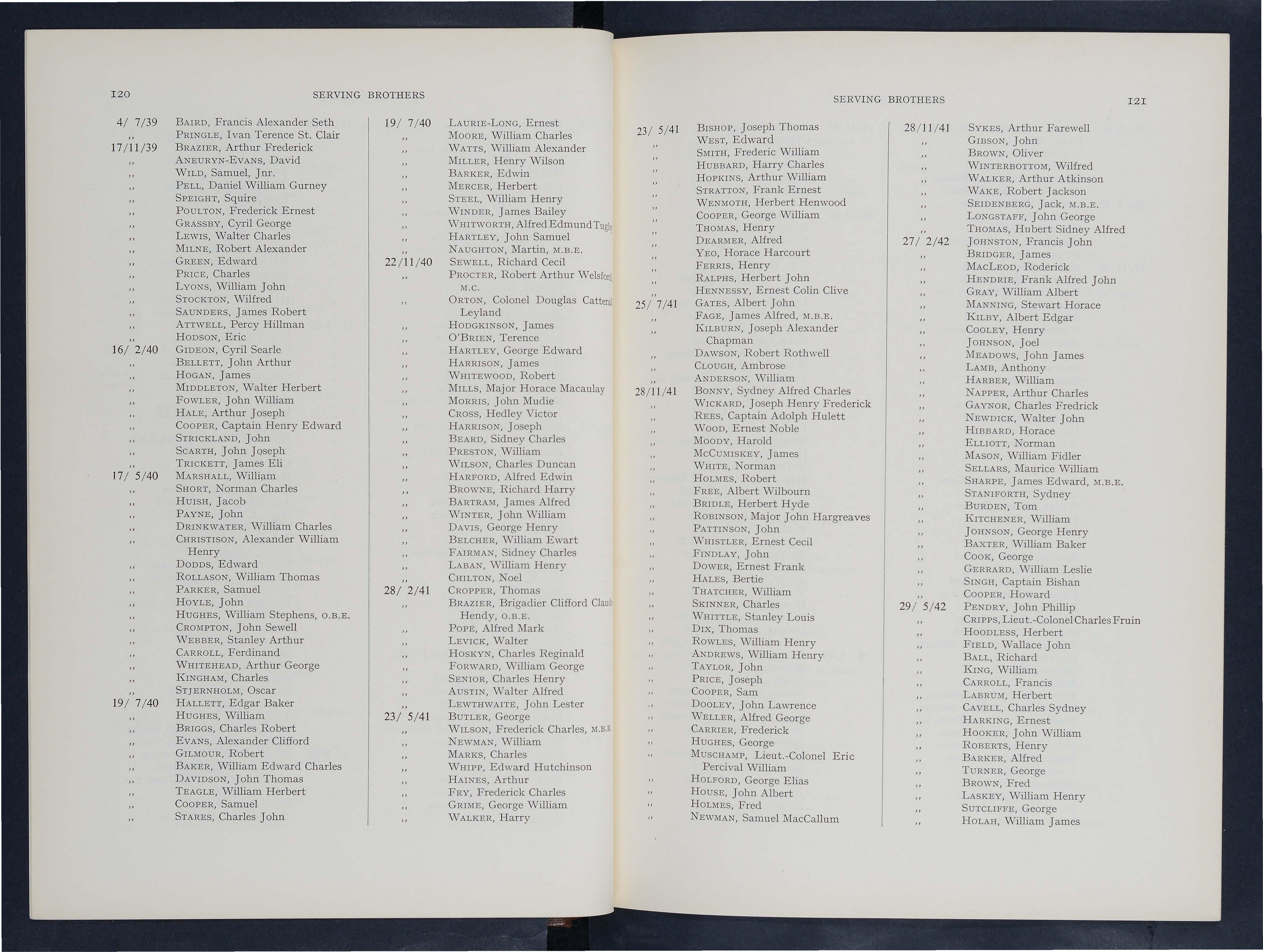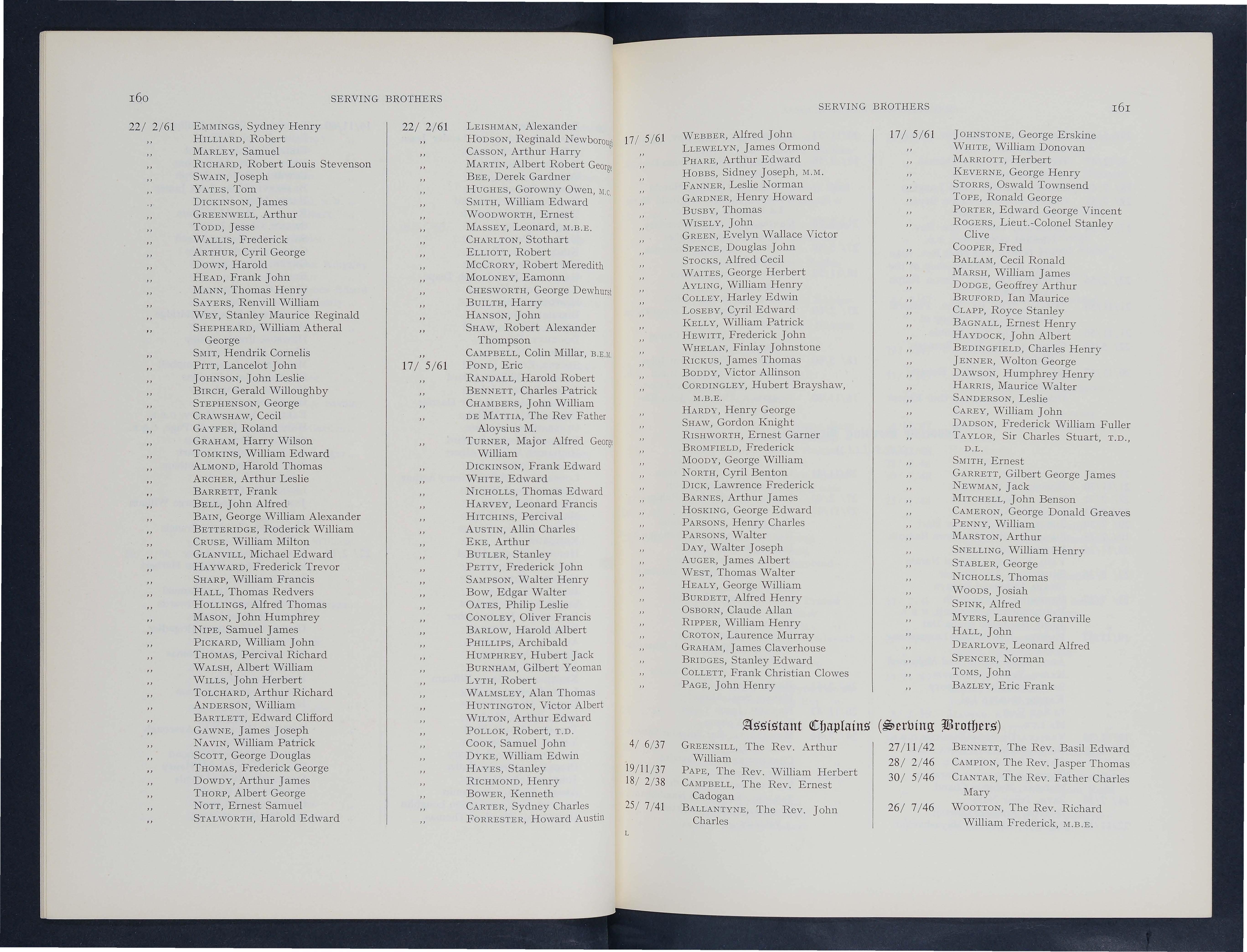 F or purpo ses of c on ve ni en ce th e Sub- Chaplain s ar e g rou pe d s eparat ely aft er th e li st of Offic ers (Broth er s ) but th ey rank with th e Offic er s (Br oth er s) f o r se niorit y in the Ord er in accordanc e with th e dat es of th e ir appointm ent or pr o m oti on. In the s ame mann er th e Assistant Chaplain s ar e g roup e d s eparat el y aft er th e li s t of S ervin g Broth er s