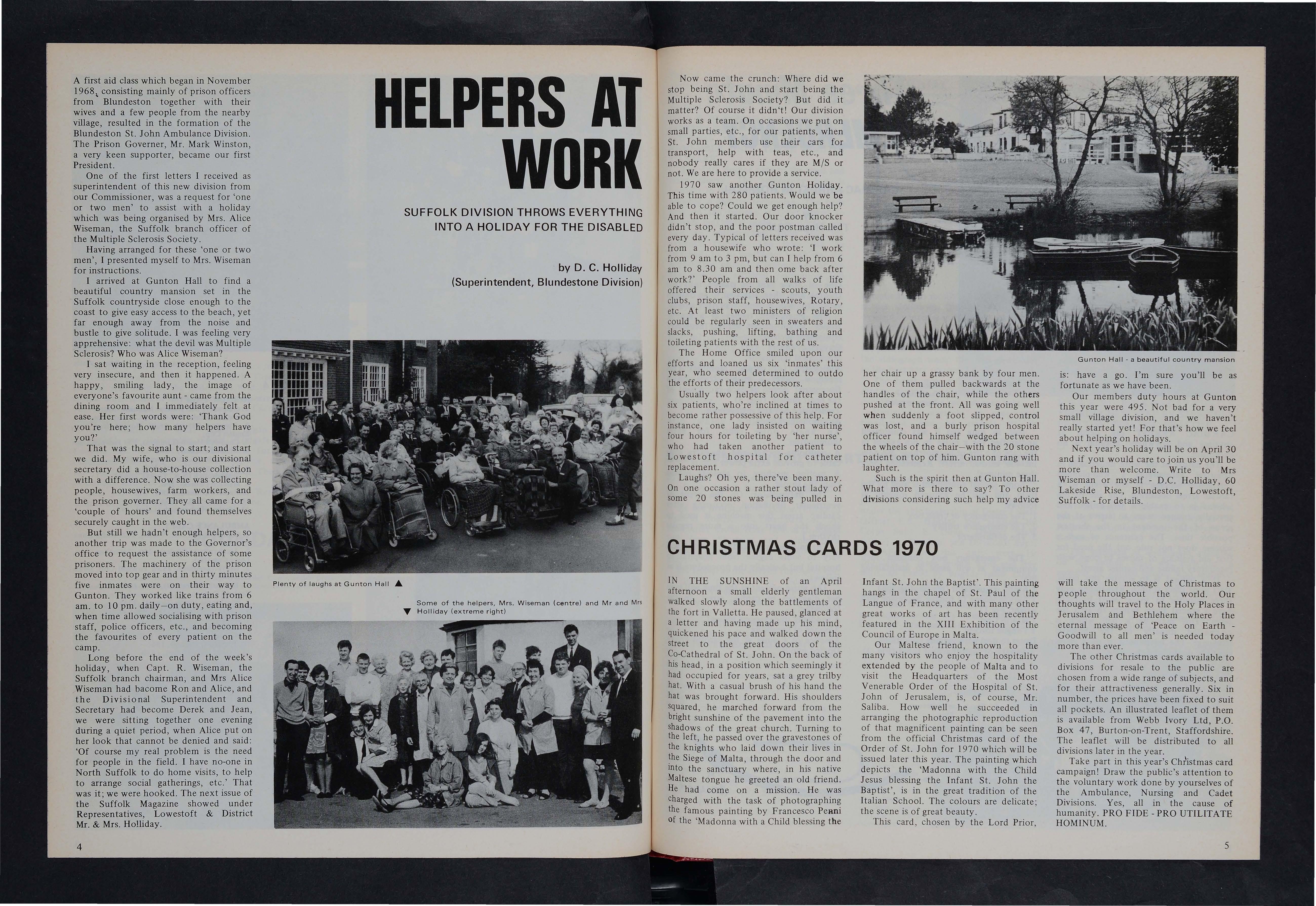 West Belfast A/N Division is one of the family divisions no fewer than five members of the Pett icre w family being members This active division has 18 ambulance members and 6 nur sing members and the D /S is Mr. F. Petticrew. It was this division that bore the brunt of the di st urb ances in the Falls Road area during the whole of the emergency an d their ambulance crews had some very narrow escapes in the m e le es when they were often caught in cross gunfire. In their area the worst rioting, burning and shooting was dur ing the we e k- end Augu st 15 to 17, a nd the entire division was on continuous duty for over 37 hours The divi sion's three ambulances operated thr o ughout that week-end, usually in the middle of the danger zone, fortunately without injury to the crews. The blue fl as h er on the roof of one of their vehicles was shot off, which gives so me idea of the proximity of the fighting. In charge of the ambulance at this time was D / O Petticrew who , as me n tioned earlier, wa s injured on St. John duty. Again this time, his home an d that of another member of his crew was destmyed by petrol bomb s but they s till carried on their first-aid work.