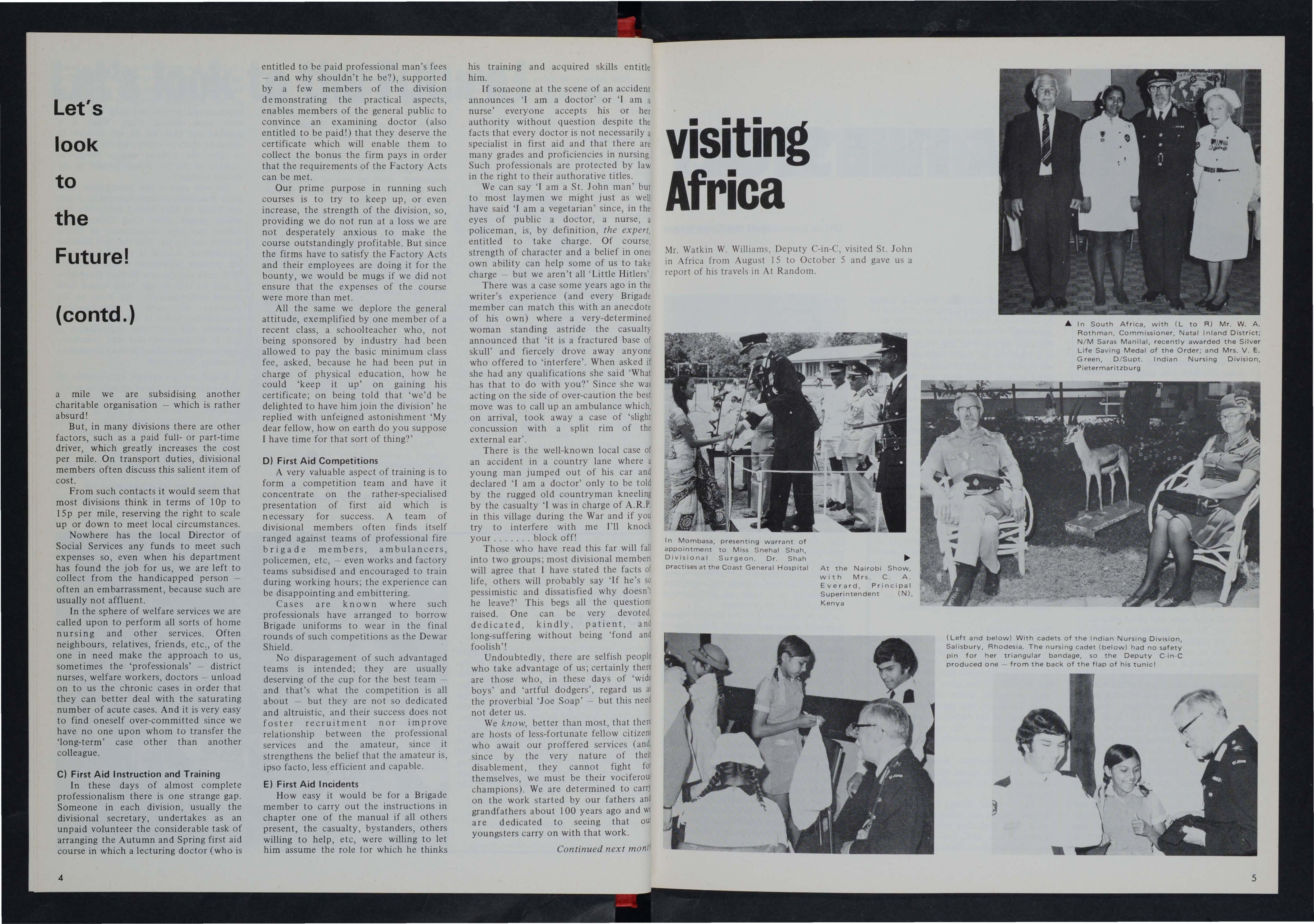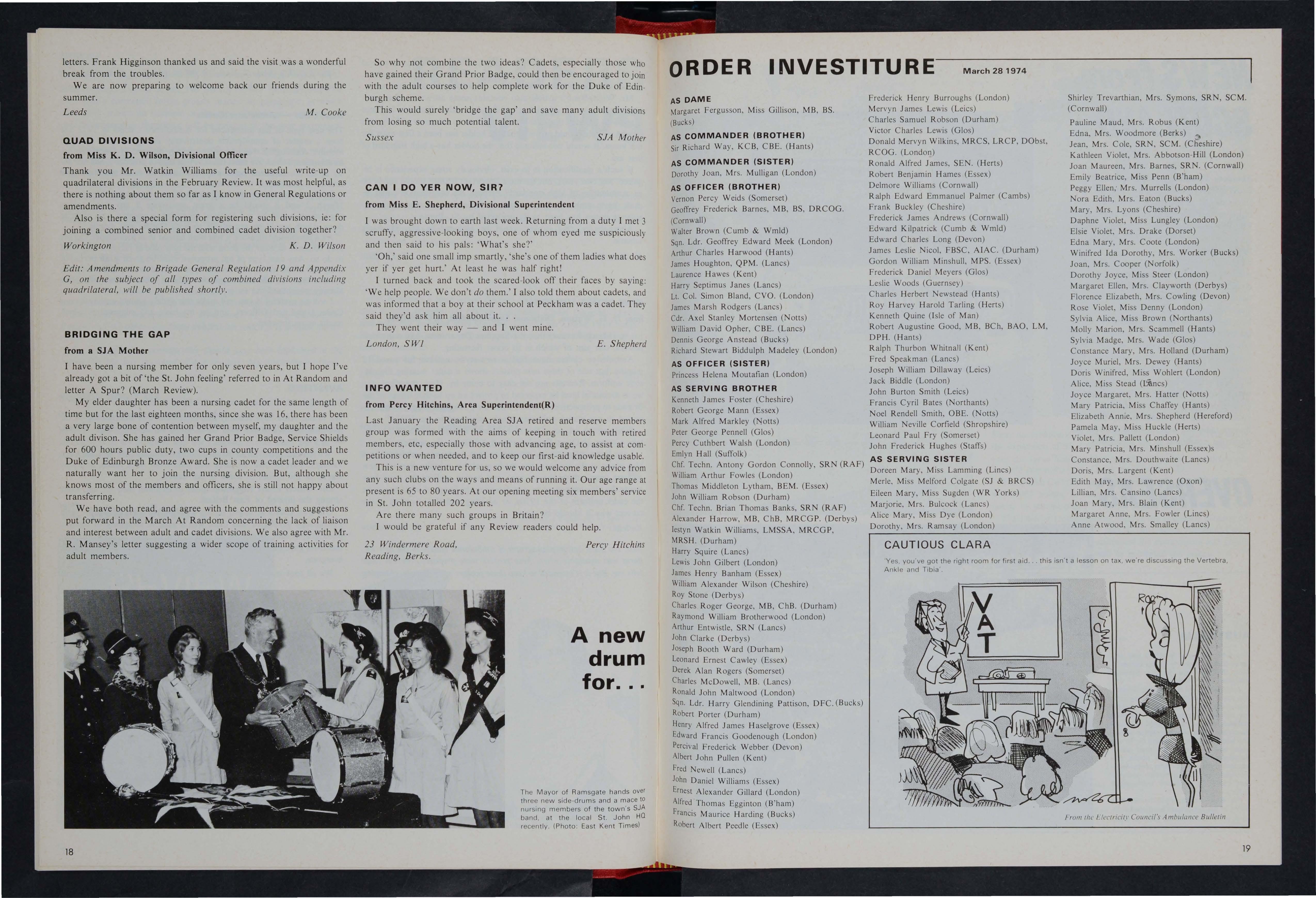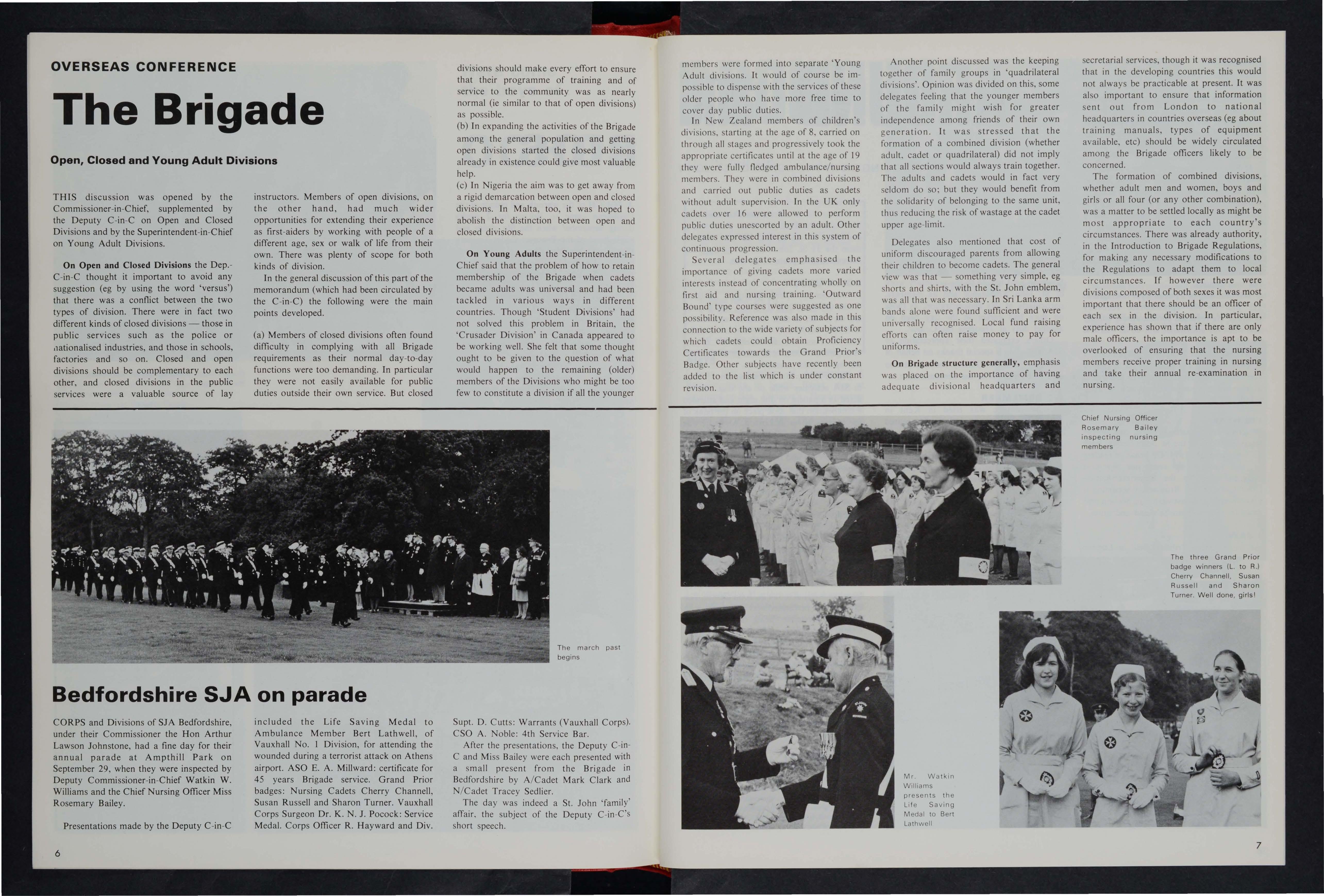 The salute was taken by Dr. Brian Price, Commissioner, Mid Glamorgan. He was accompanied at the saluting base by Dr. Manna Price; Dr. Roy Treasure, Assl. Commissioners Cynon Valley, and Dr. Sybil Treasure the Mayor and Mayoress of Cynon Valley; Lady Williams, DStJ, Chairman St. John Council; Asst. Commissioner(R) Mr. S. Sage; and Asst. Commissioner (Nursing) Mrs. R. M. Protheroe. The parade was led by District StafT Officers L. Rees and Mrs. P. Harrison - Roderick (R). Oil arrival at the church all were met by the vicar, the Rev G. H Bowen The Colour Party (Nursing Cadets) came from the Cwmaman Division, and the Code of Chivalry was read by a cadet also from Cwmaman Division. During the service, Dr. Brian Price presented the following awards: