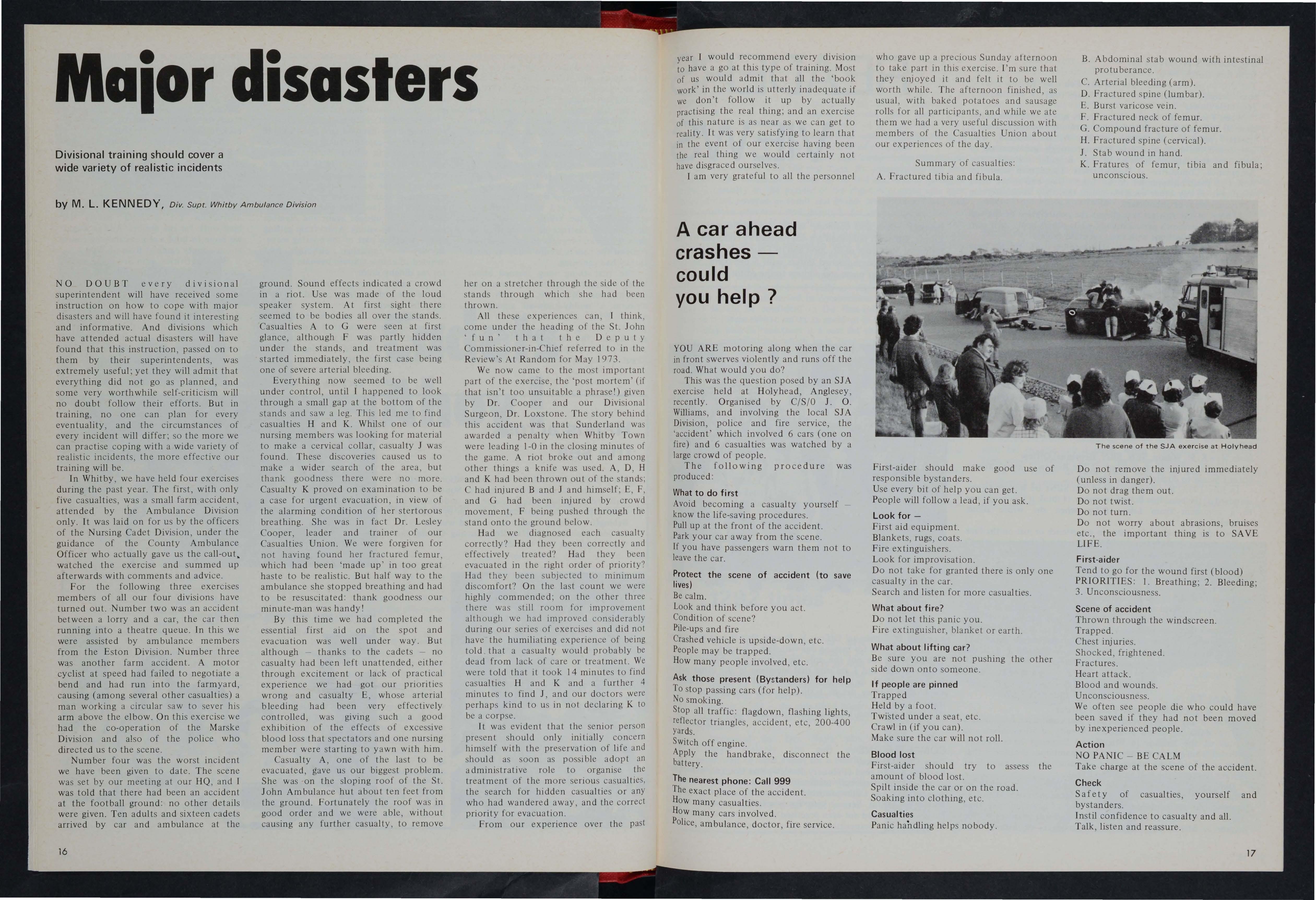 Mistakes were made and lessons learned, but everyone voted the exercise time well -spent and of value if any incident of this nature should occur in the future. It was also an examp le of excellent co-operation between the Police and the Brigade, as well as local Army Cadets, Boys Brigade and Scouts who helped to make up the crowd and some of the casualties with St. John Cadets It is hoped to plan another combined exercise in different surroundings as a further test of Police and Brigade efficiency.