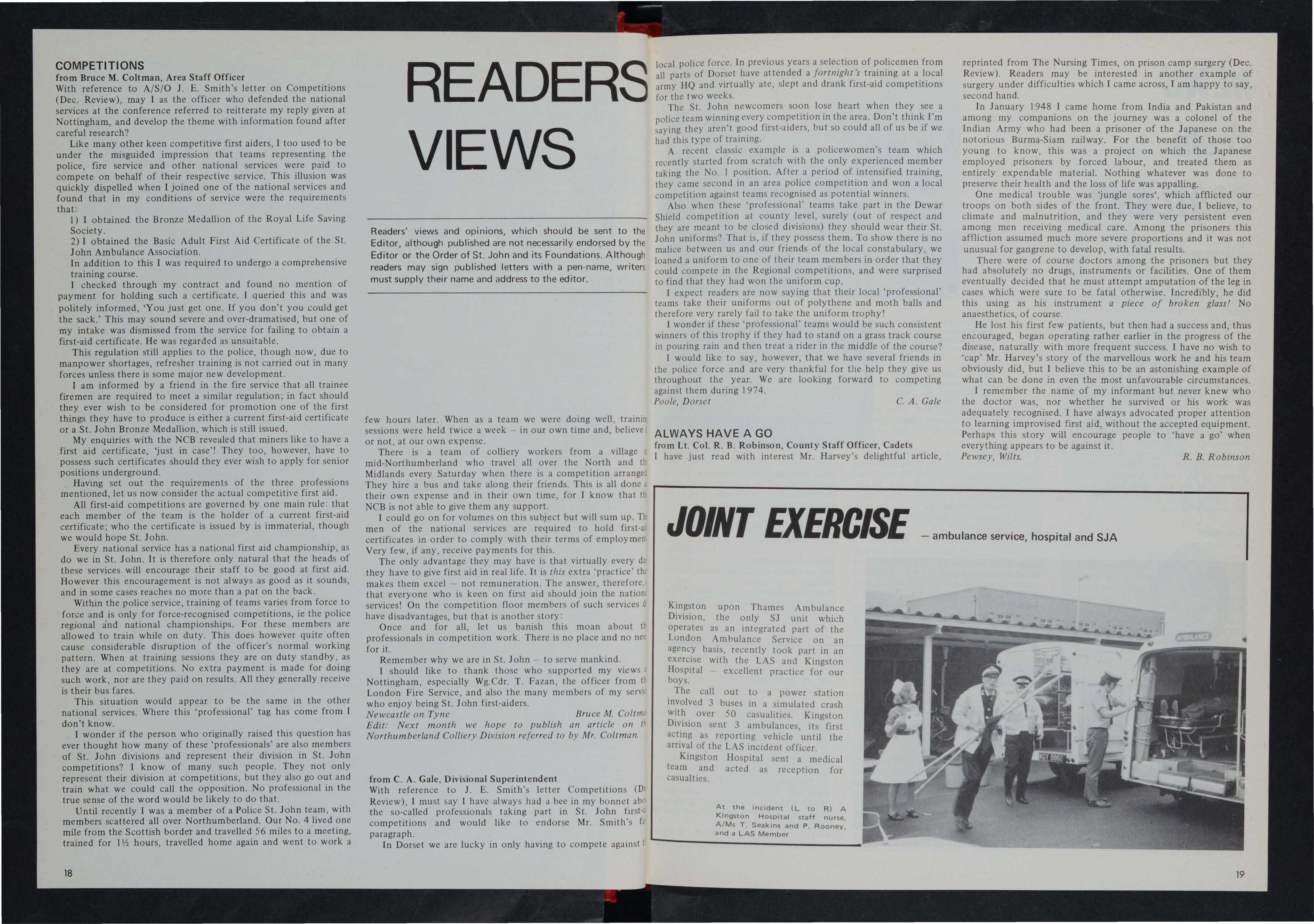 During 1974 it is proposed to issue twenty sets of marking shee t s relating to national first aid competi tion s. The se will be made available after each event occurs and consist of one team test plus two individual test s at a subscription of £6 00p for the year's supply.