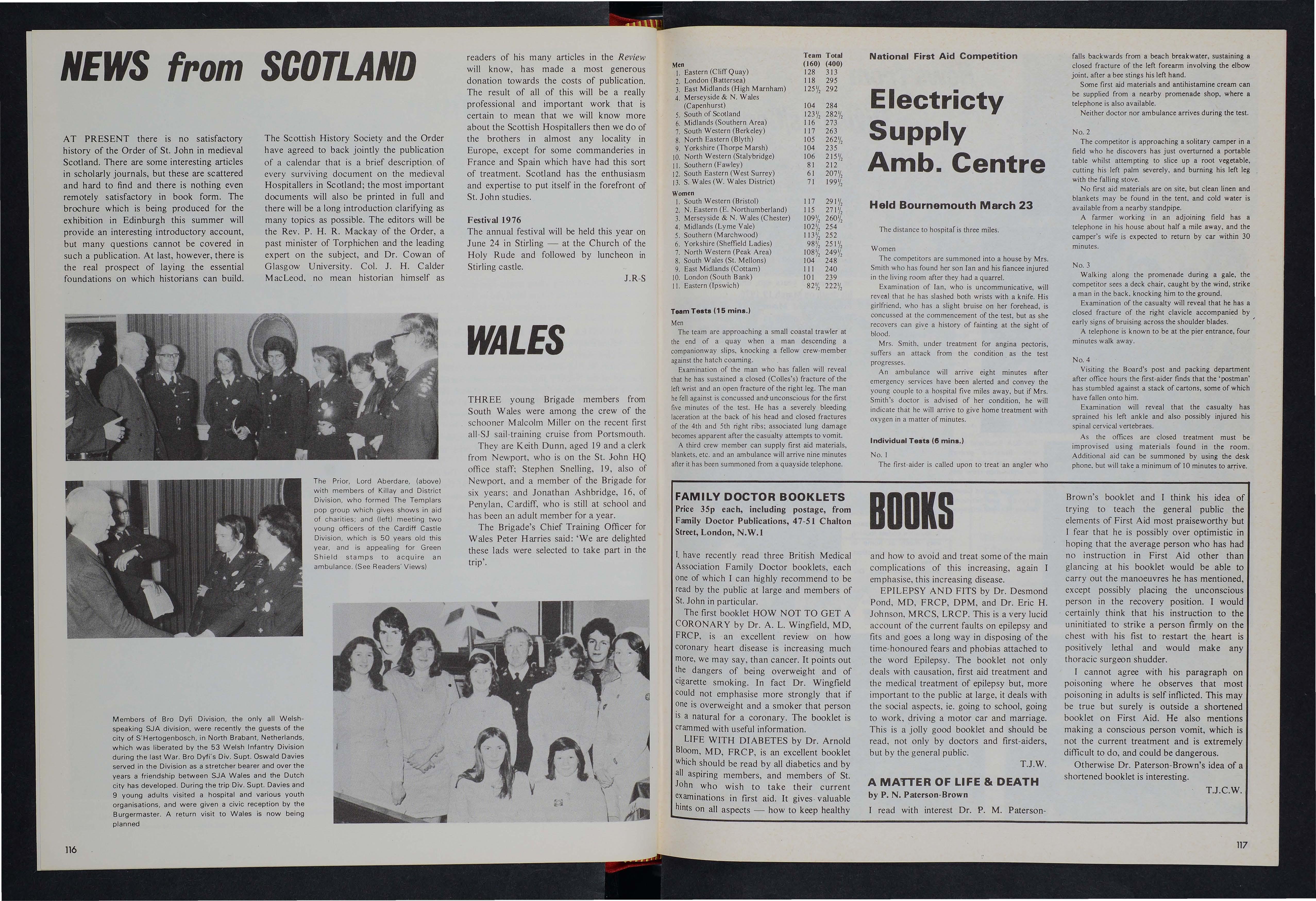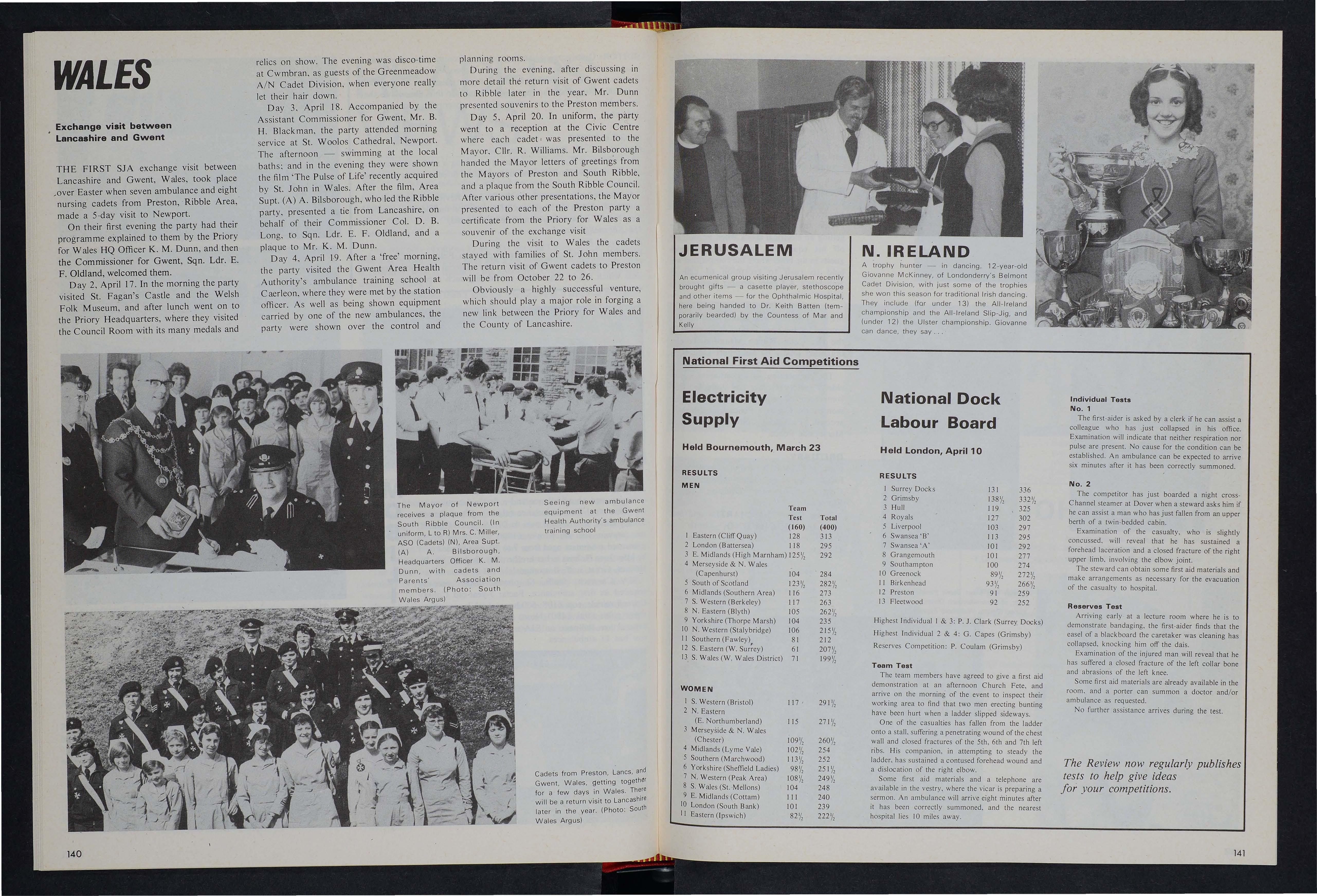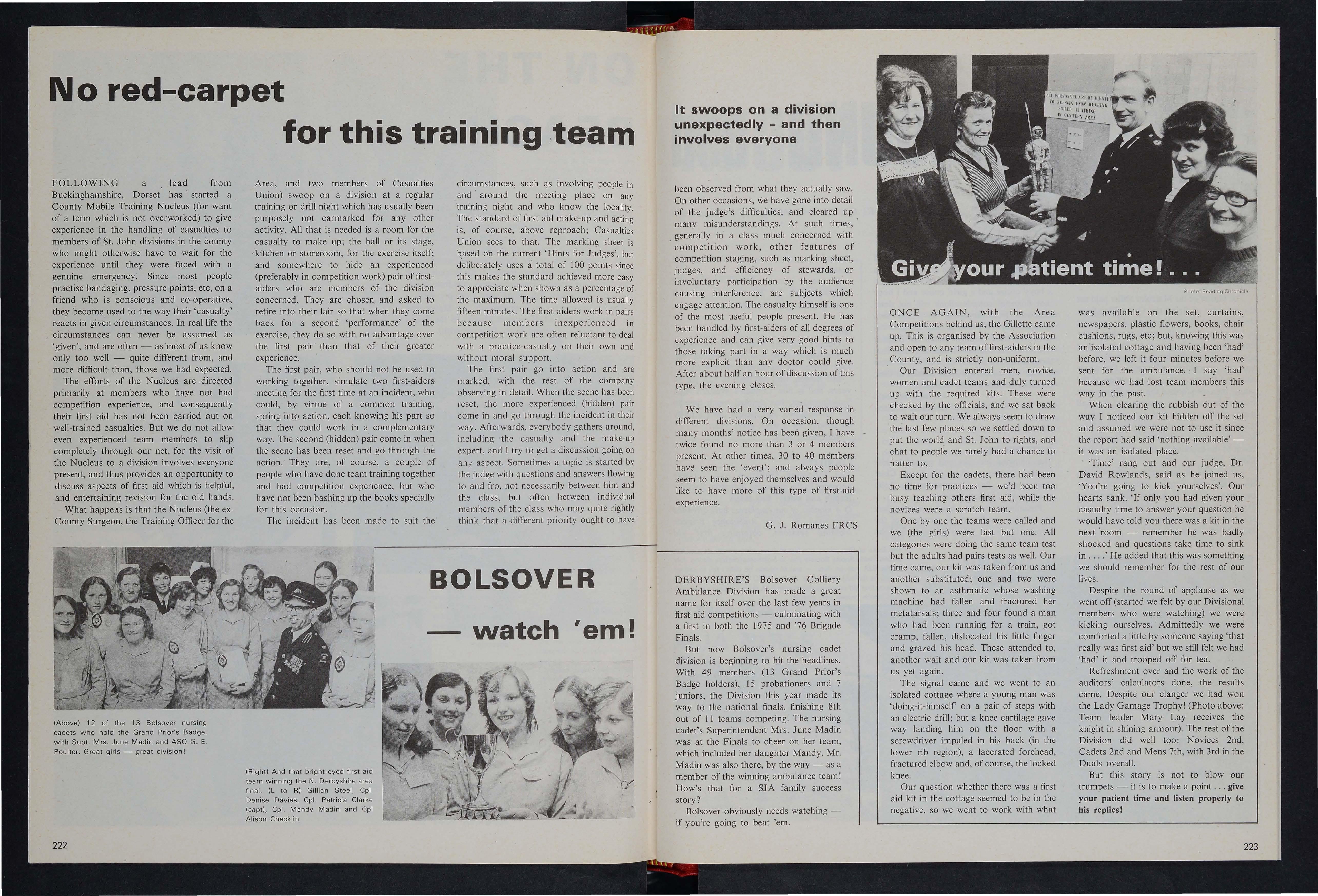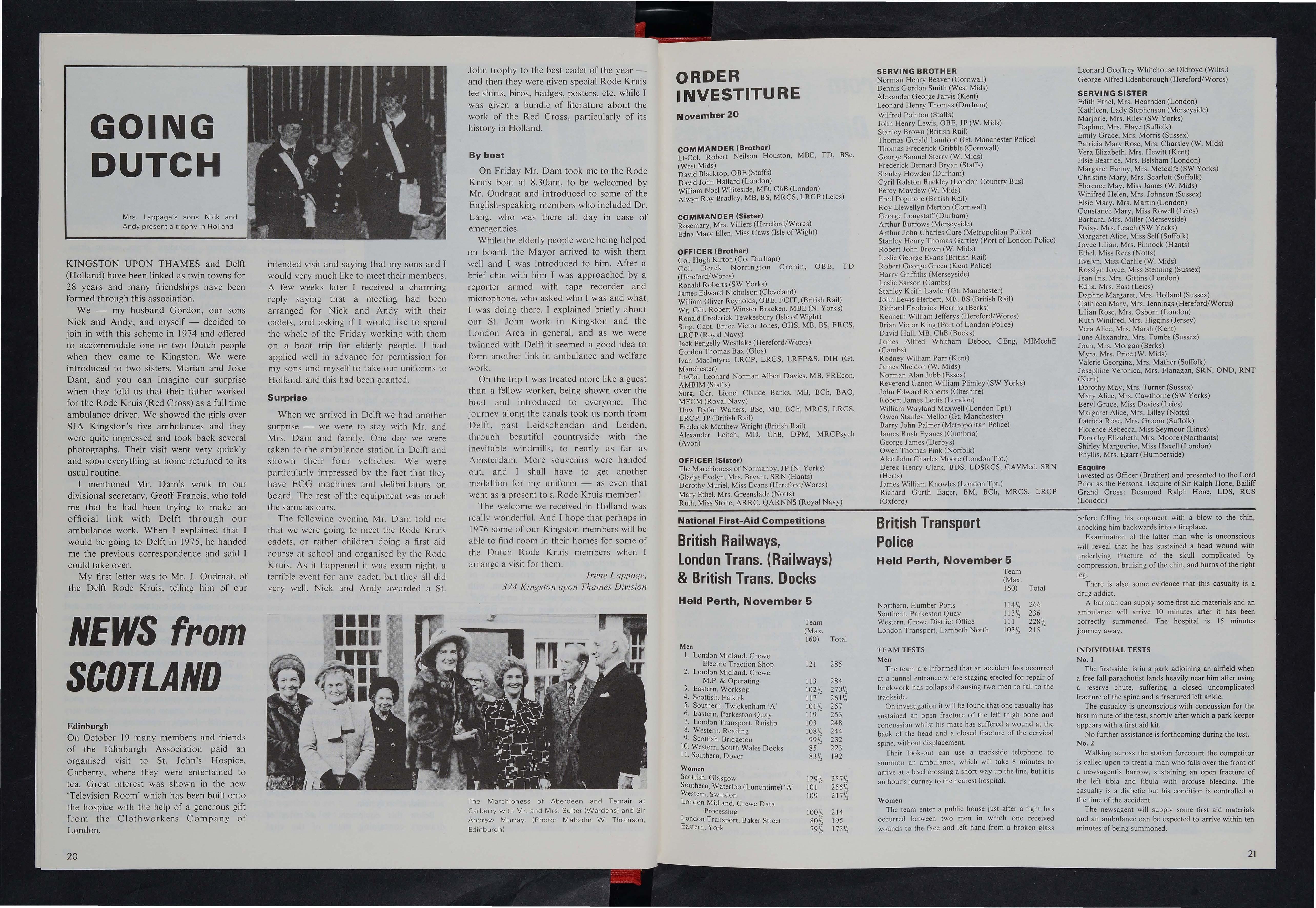 The - winning team in the men's competition for 1975 was the Fire Brigade team from the County of Avon; the Lancashire Constabulary team (the previous year s winners) came second , and the Port of London Authority Police team were third In the women's competition the winners were a smashing team of girls from the Lancashire Constabulary; a team representing British Railways from Glasgow came second , and a Cornish team from English Clays Lovering & Poch i n Co. Ltd. came third. Congratulations to them all- and indeed to all those who competed - remembering that the whole object of the exercise is not primarily to win a trophy (splendid though that is for those who do so) but to make each one of us better able to give compassionate and life-saving help to our fellow human beings at any moment of accident, suffering or distress , "and that ' in this game there are no real losers
