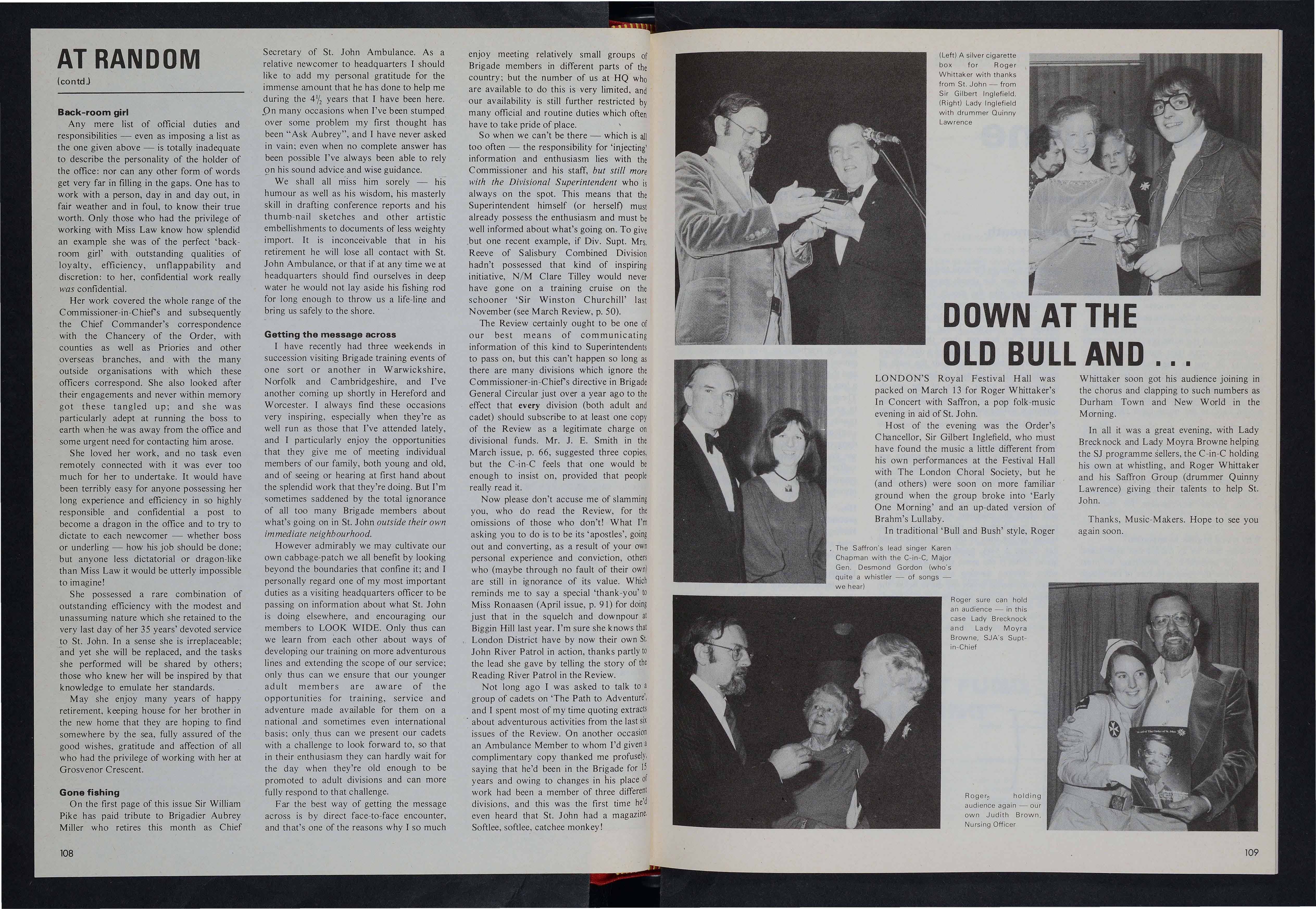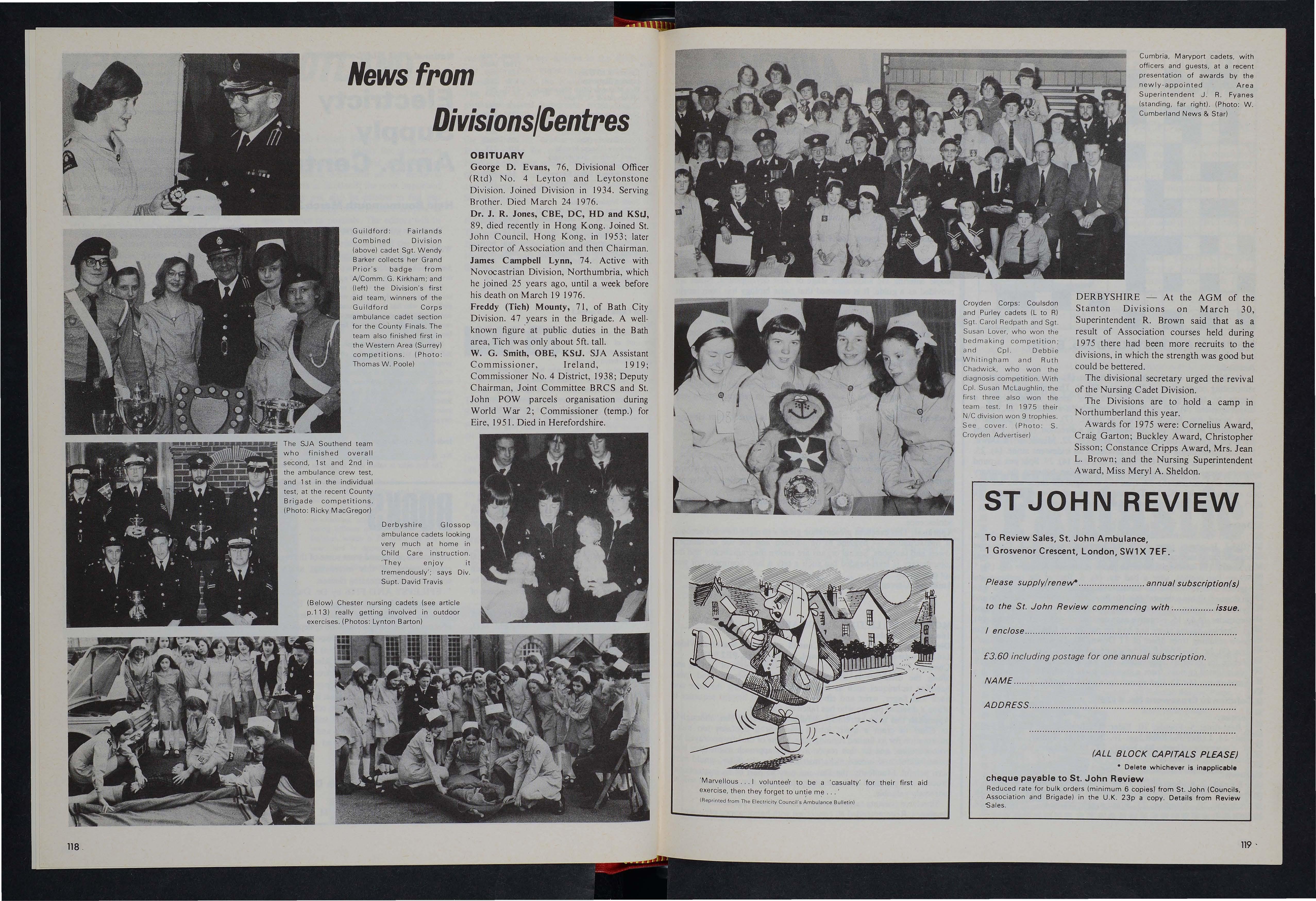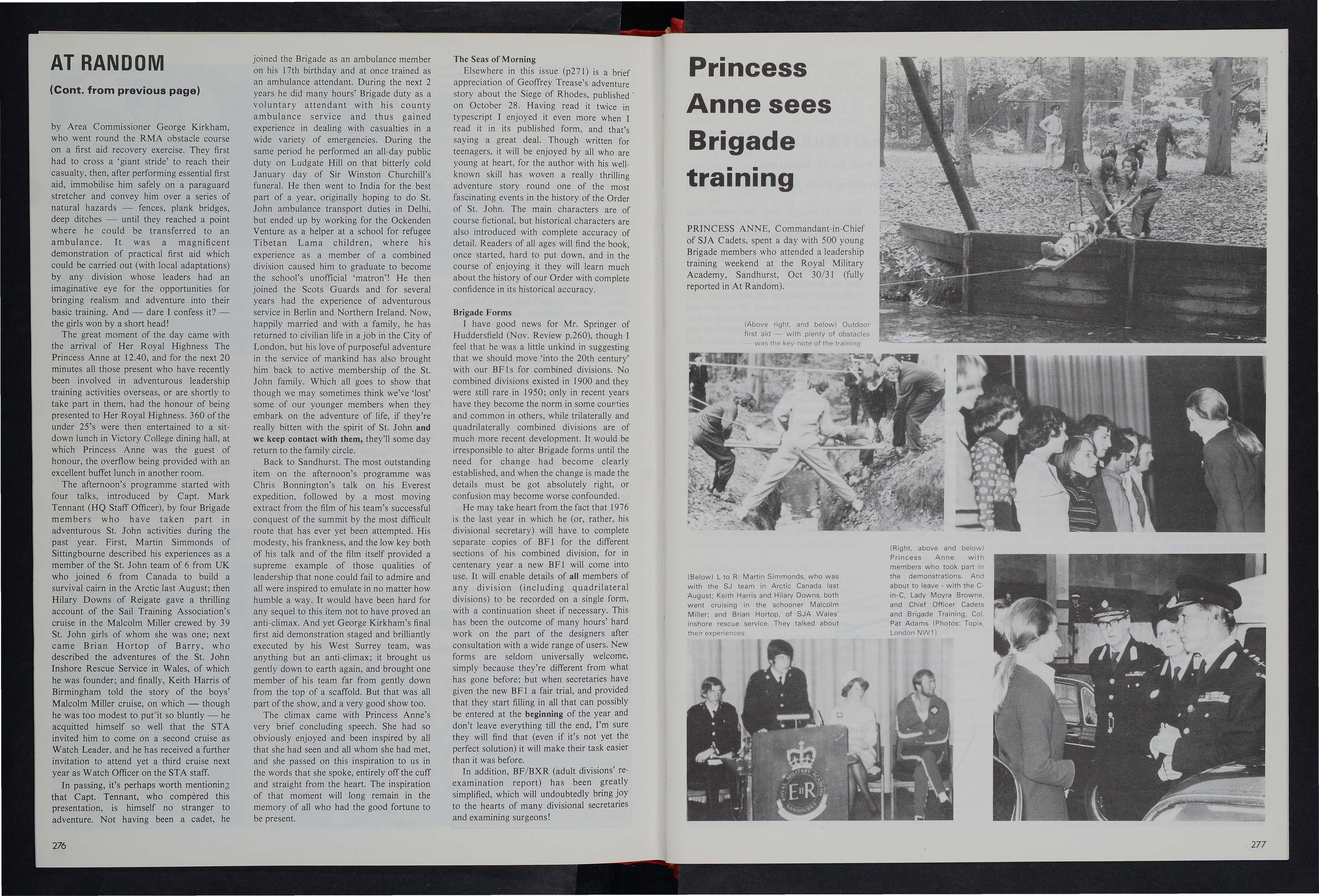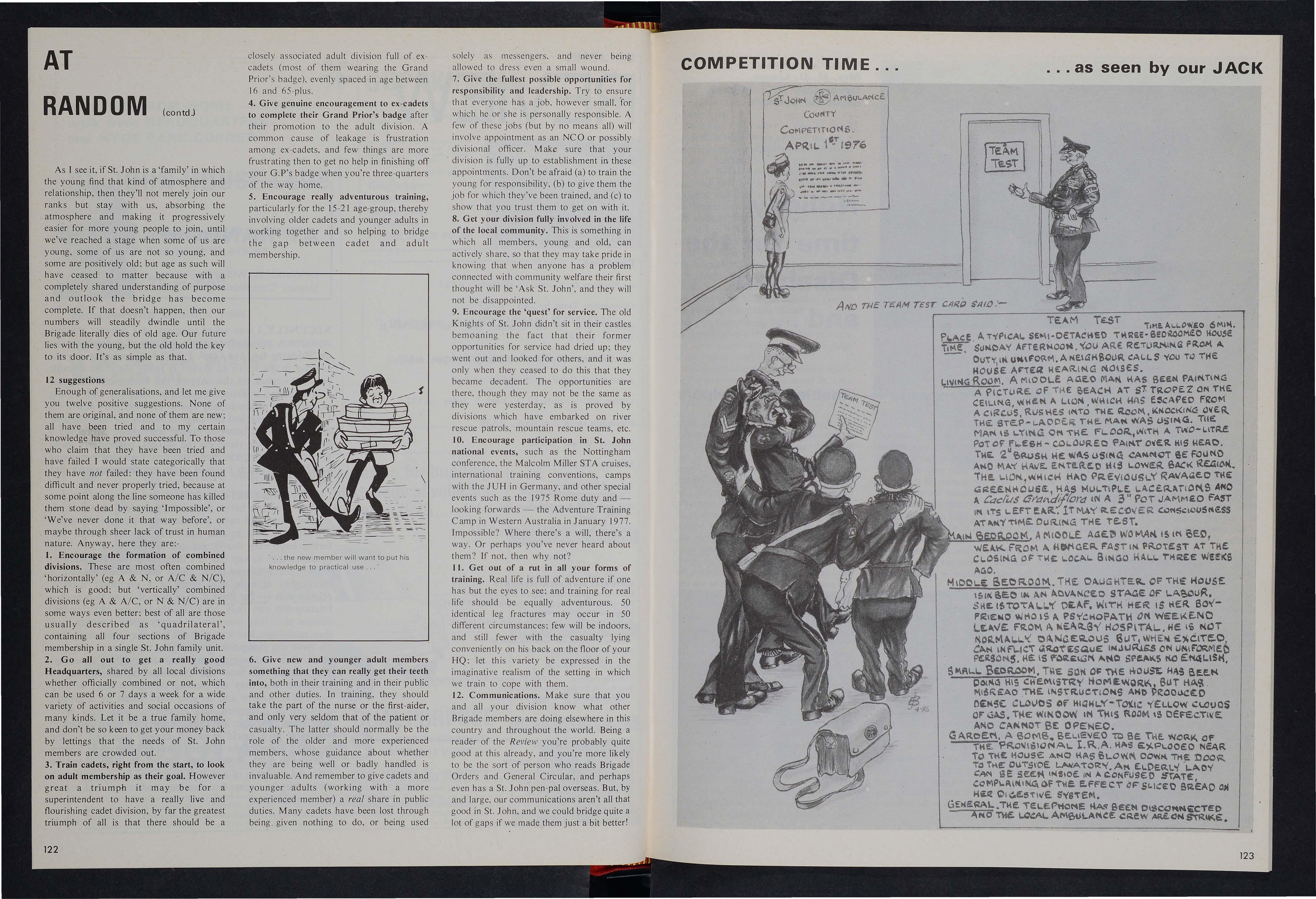 Perhaps there is a need to emphasise both goals when we strive to attract young people to St. John think we shall do well to ponder these wise words and apply them to our older as well as our younger members. The service of mankind must always be a challenging adventure , and our training for it must be challenging and adventurous too. Many of our leaders are already aware of this fact and act on it: those who do not are in danger of losing their right to hold positions of leadership , for they have certainly lost the power to lead: theirs are the divisions which sooner or later fold up through lack of purposeful and adventurous programmes , inability to see opportunities for new ways of serving when in a changing society some of the older ways disappear, and consequent inability to attract new recruits