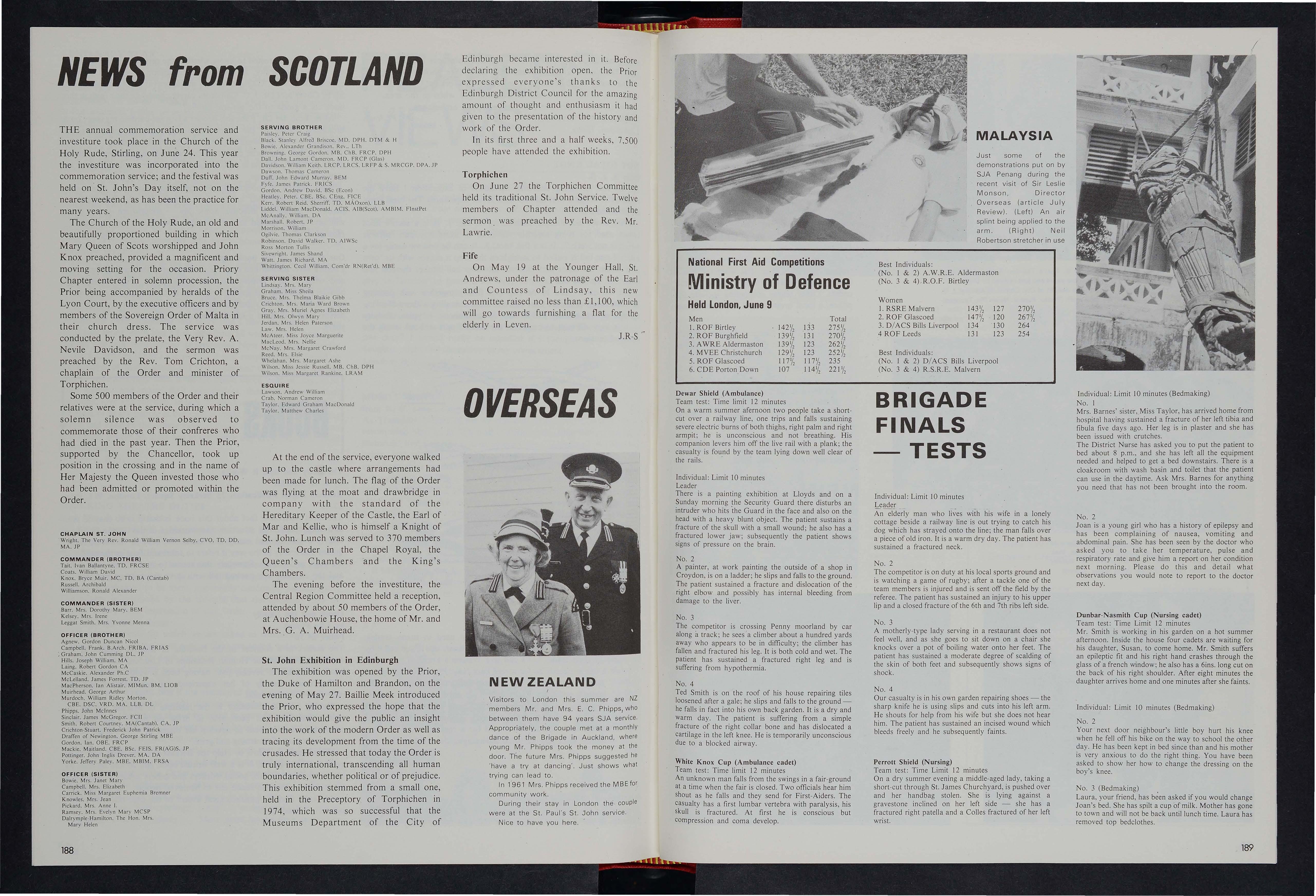 THE GRAND PRIOR'S Trophy Competitions, held annually at the Seymour Hall in London at the beginning of December, provide an exciting climax to the year's programme of competitive first aid training throughout the whole of the St. John Ambulance Foundation in the United Kingdom. The 22 competing teams were the winning finalists in one or other of the national competitions held by the St. John Ambulance Association for the Police, the Fire Brigade, the Post Office, a wide range of national industrial concerns, and the St. John Ambulance Brigade. Many thousands of men and women throughout the country are actively involved in these competitions for many months before the great day arrives: one therefore expects the first aid at the Seymour Hall to be outstanding in quality; and in the mainthough even the best first-aiders occasionally suffer from an attack of 'competition nerves' which makes them do foolish things that they would very probably not do in a genuine emergency - that expectation is amply fulfilled. It was a special pleasure this year to have our new Grand Prior with us to witness the latter part of the competitions and to present the trophies. His Royal Highness is no newcomer to first aid and watched the teams' performance with a critically appreciative eye, for he first qualified at an Association first aid course some 13 years ago and still holds a valid certificate, while the Duchess of Gloucester (formerly a Staff Officer at Brigade HQ and now Commandant-in-Chief of Nursing Divisions in the Priory for Wales) currently holds valid certificates in both first aid and nursing. In his speech before presenting the trophies the Grand Prior warmly congratulated both the winners and the losers, adding 'except that in this game there are no real losers'. He then went on to speak of the vital importance of spreading basic knowledge of first aid as widely as possible throughout he whole community, with special reference to our aim of having 'a first-aider in every home and to the 2-hour Emergency Aid sessions that we shall shortly be holding throughout the country and which will be specially publicised on television.